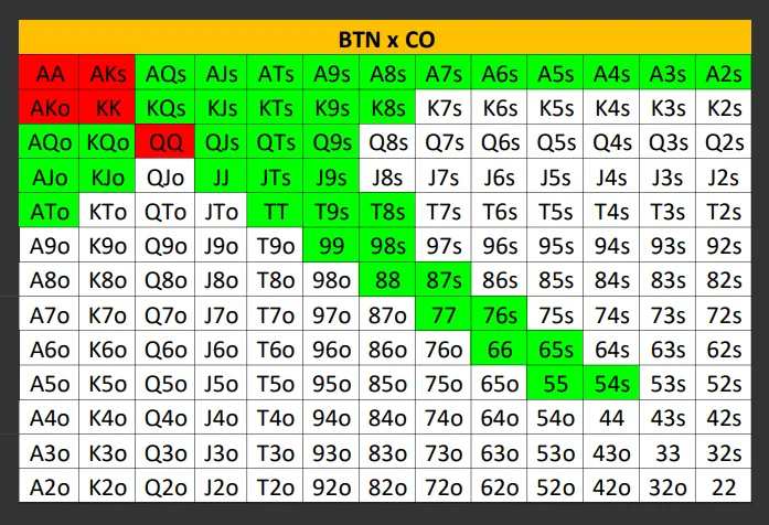 All the hands in green and red should be played as a 3-bet when we’re on the BTN against an average reg who open-raises before us on the CO!