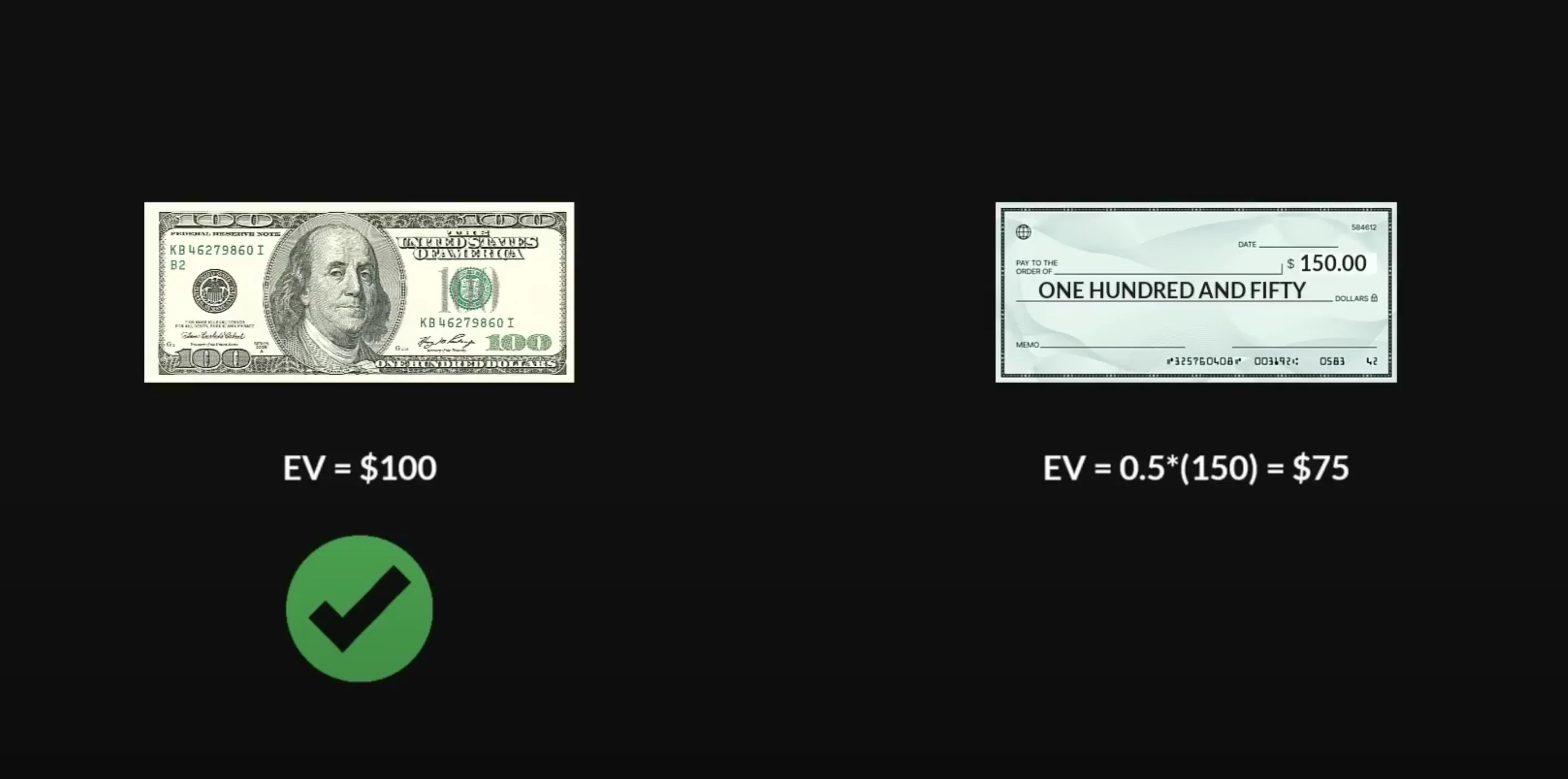 As an analogy, imagine if you had to choose between $100 in cash, or a $150 cheque — but the cheque has a 50% chance of bouncing. The prospect of an extra $50 might be tempting, but anyone who understands expected value would go for the $100 cash.