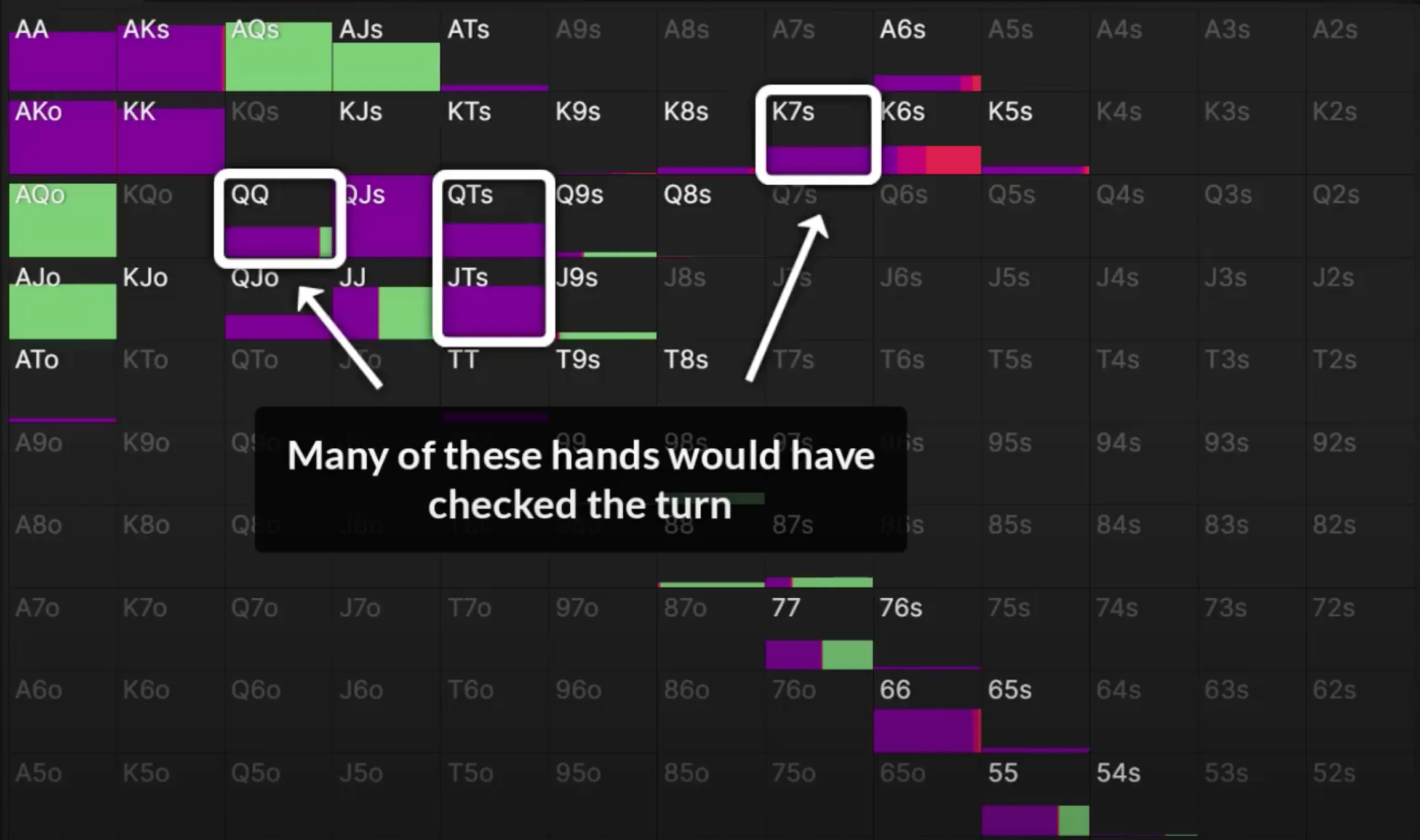 This is exactly why the solver sizes down on wet boards like 865 two-tone. Not only do we lose less the times we run into two pairs or a straight, we also secure more value against weak bluff catchers like Q5 and J6 — hands that we are almost guaranteed to make money against.