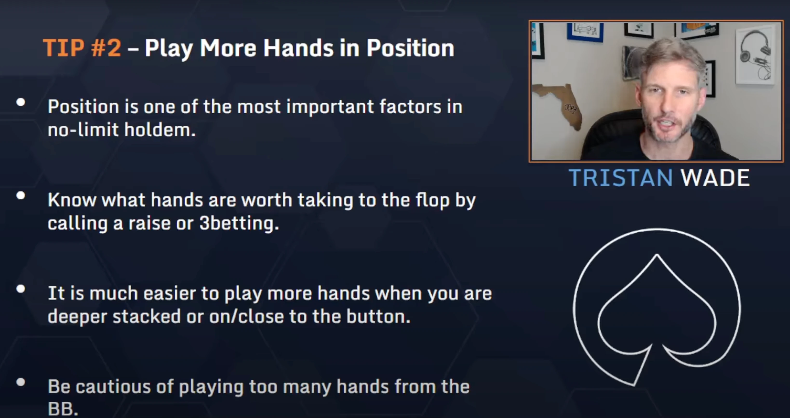 This one sounds obvious, but it’s a huge edge — play more hands when you have position. Position is one of the most powerful factors in NLHE poker. Acting last means you see what your opponents do before making your own decision, giving you more information and control over the pot.