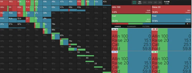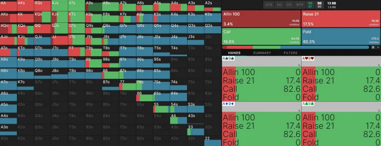 Against the BB 3-bet range, the SB 4-bet range widens considerably compared to the earlier UTG scenario. This is primarily due to the BB wide 3-bet range.