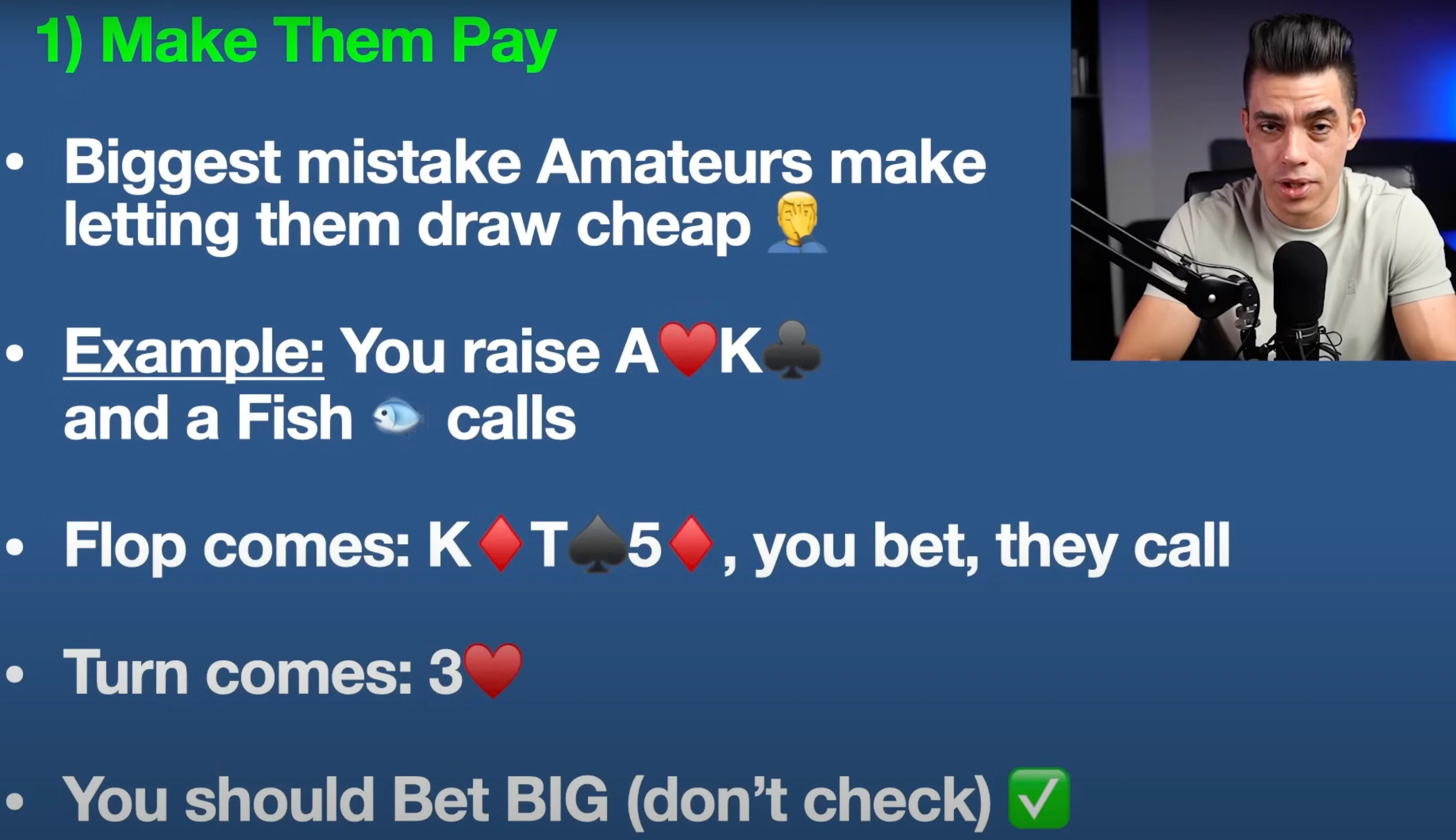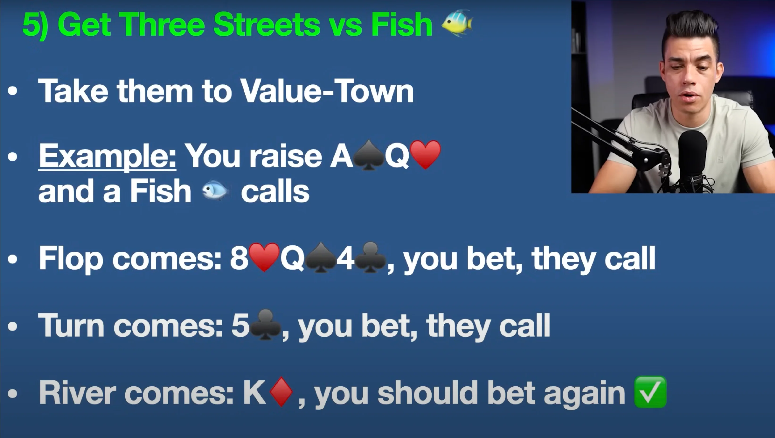 That’s what fish do. They don’t fold — they convince themselves you’re bluffing. So what do you do? You go for that third street of value. It sounds pretty simple — BET EVERY SINGLE TIME!