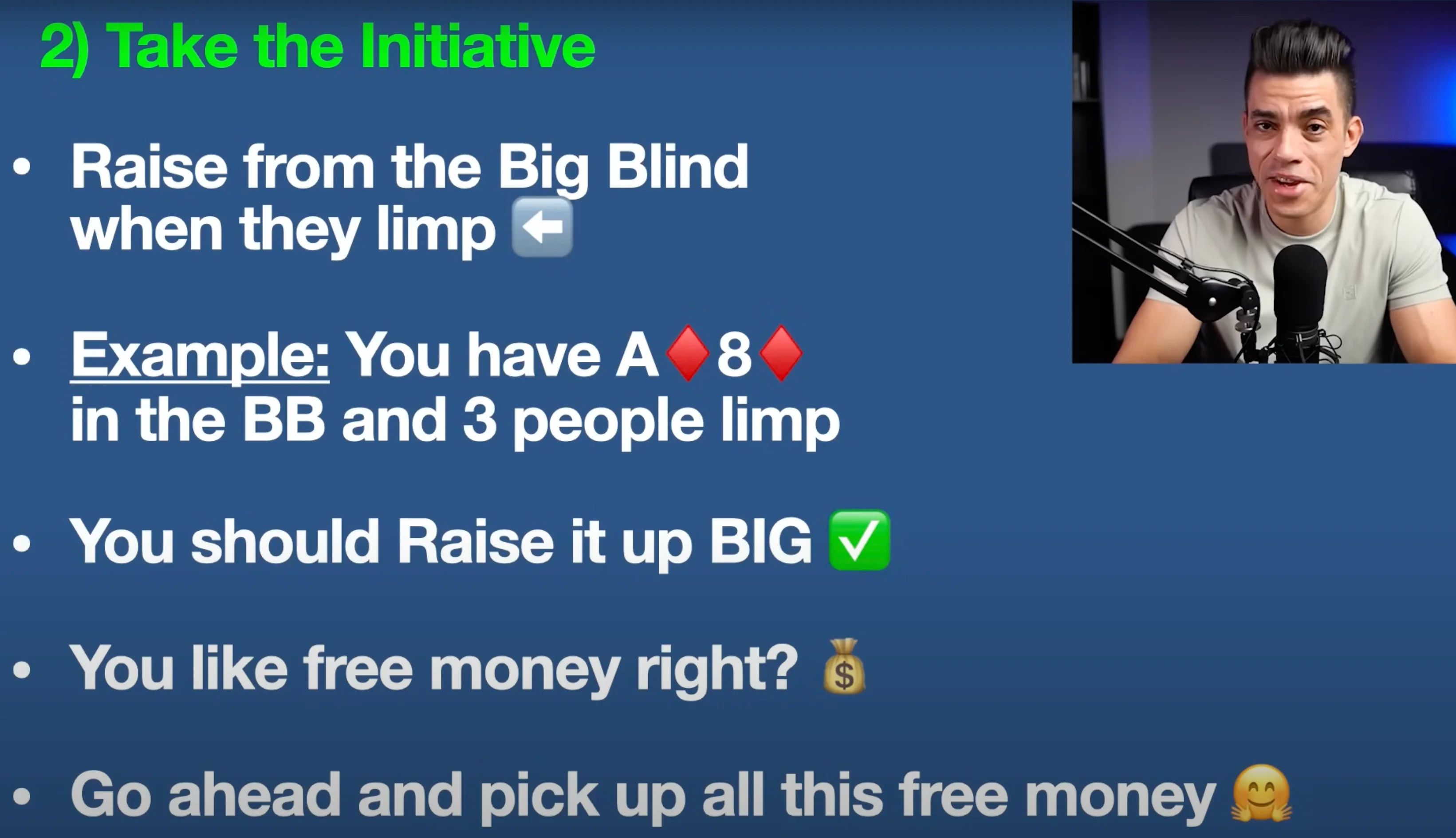 Don’t limp — punish limpers. Instead of checking or just calling along, raise it up big from the big blind. Even with hands like suited Aces or decent Broadway combos. You're playing against weakness, so you should respond with strength.