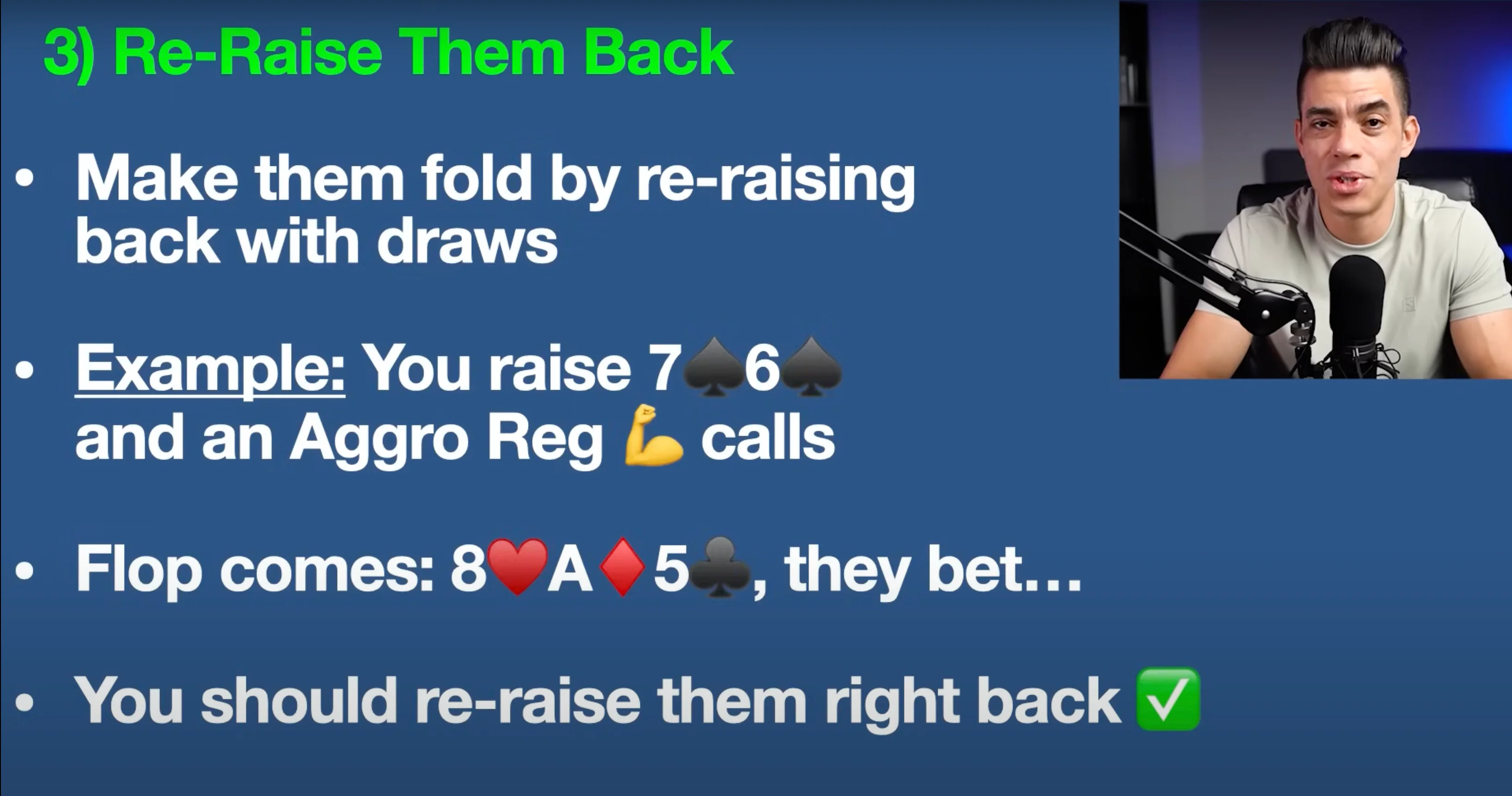 Instead, you can represent strength now, and potentially take the pot down immediately, with a re-raise. Why this works so well: Aggro regs aren’t used to being pushed around. When they face resistance, especially in the form of a strong re-raise, they often back off unless they’re holding the top of their range. You’re putting pressure on their aggression — flipping the dynamic on its head.