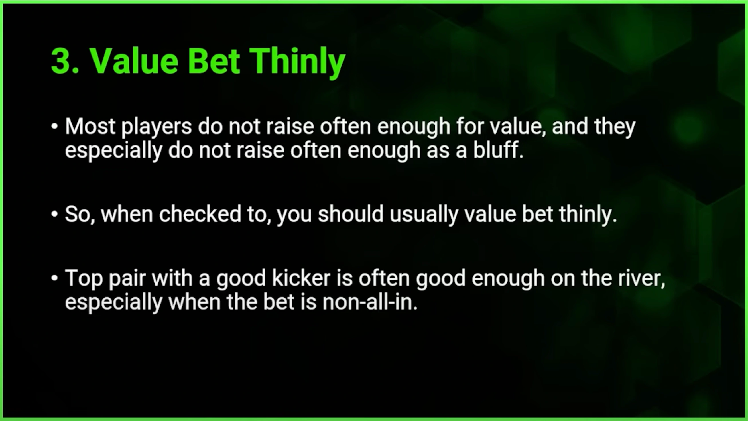 When opponents do raise, their range is usually very polarized — either monsters or bluffs. In those cases, your top pair with a weak kicker or middle pair with a decent kicker isn’t in great shape. Use thin value bets when opponents rarely raise.