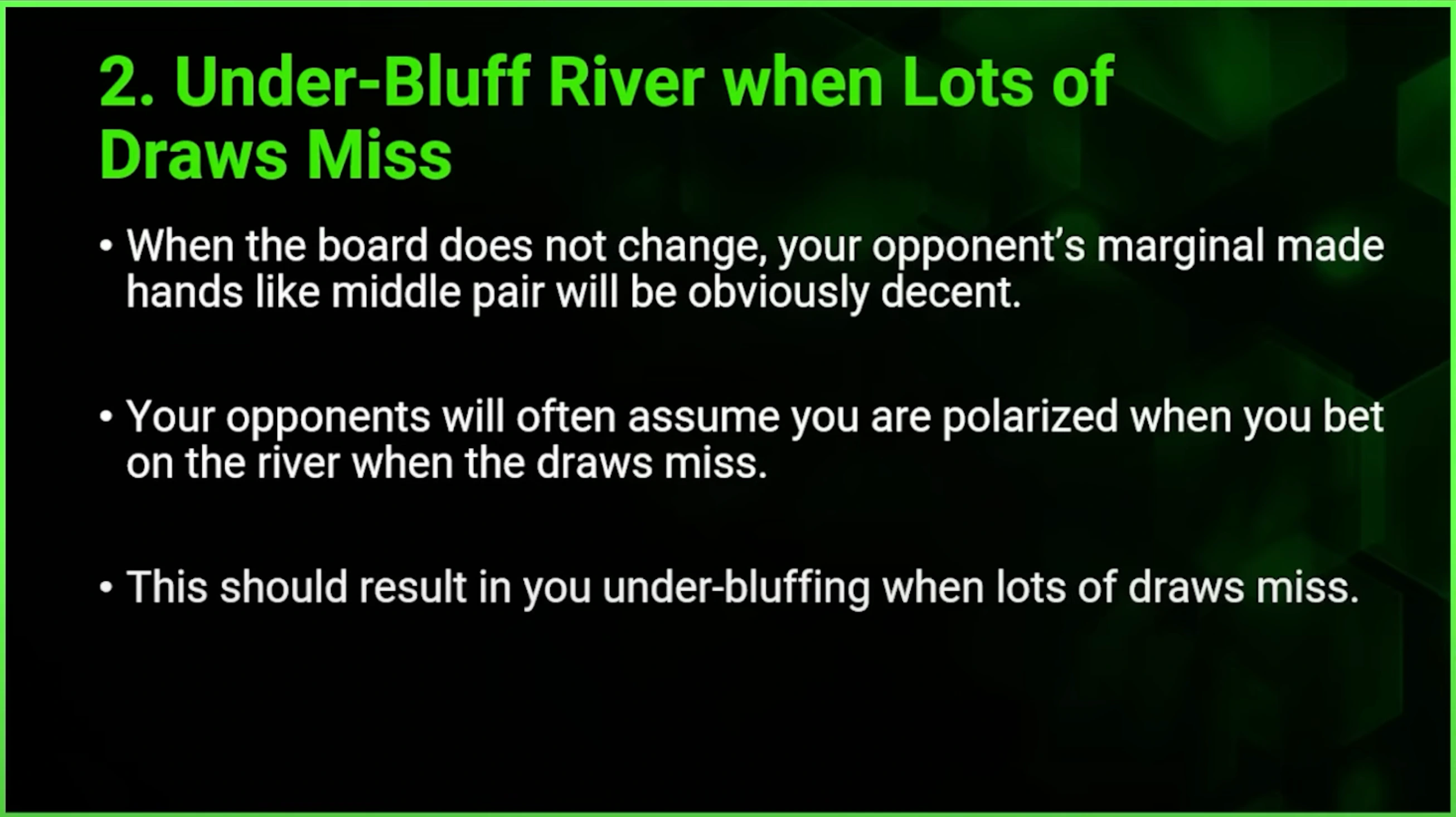 When all draws miss and your opponent is sitting on a pair, that pair is actually pretty strong. This is another situation where you should lean toward underbluffing.
