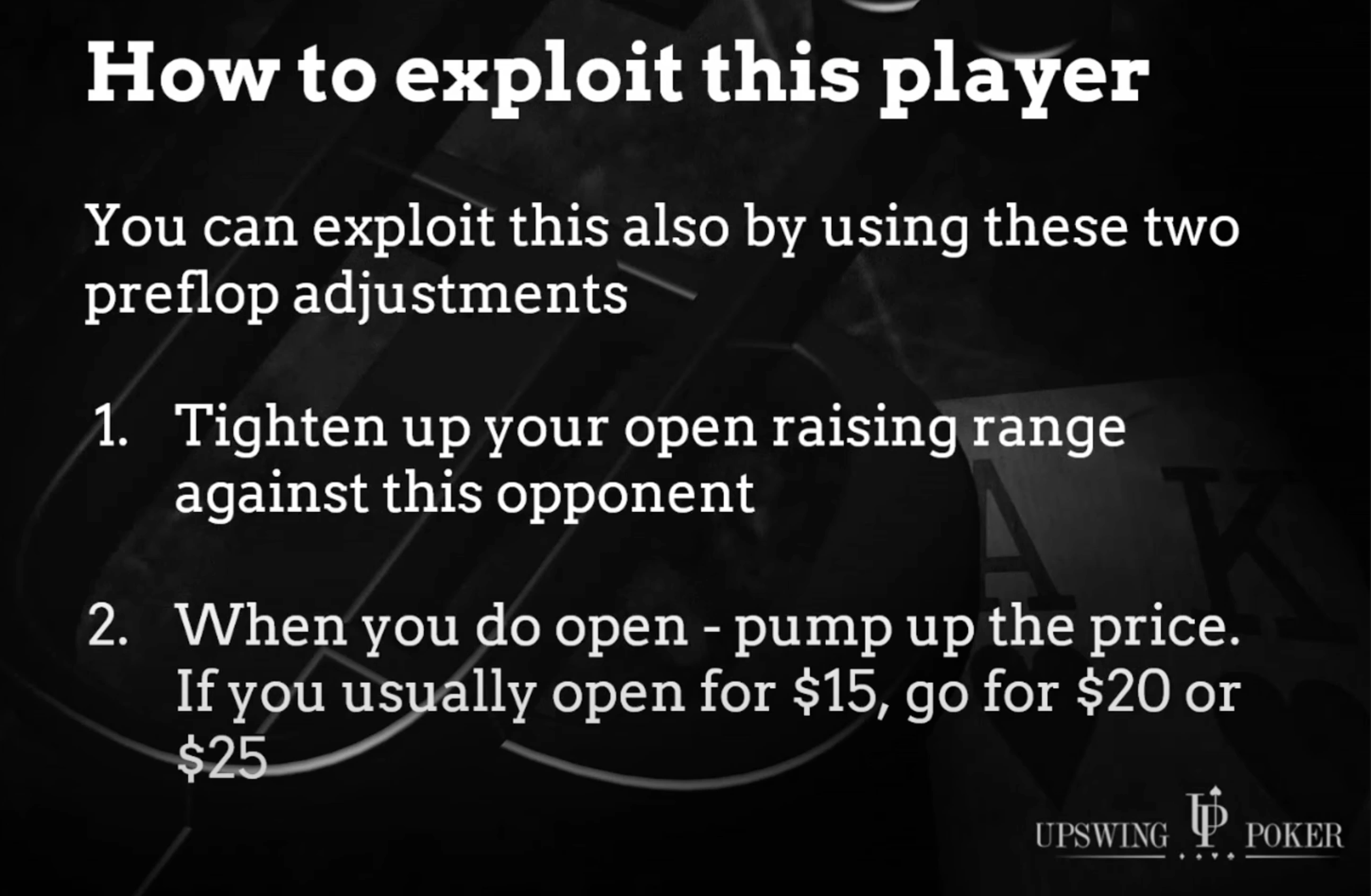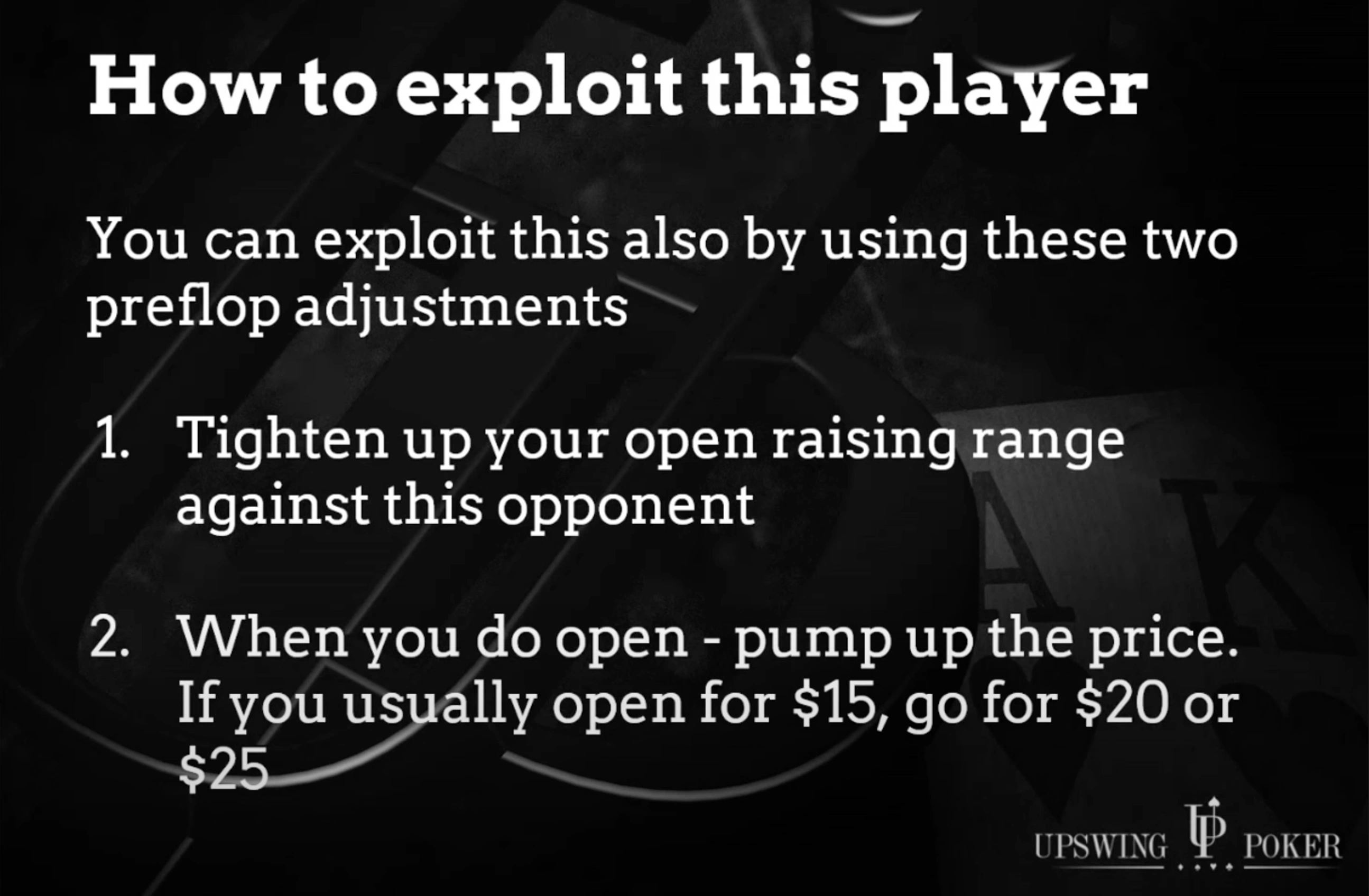 Now, what exploits can we use to counter this player? There are actually two here. The first one is really quite obvious: we tighten up versus the larger raise size — fewer marginal calls and fewer marginal 3-bets.
