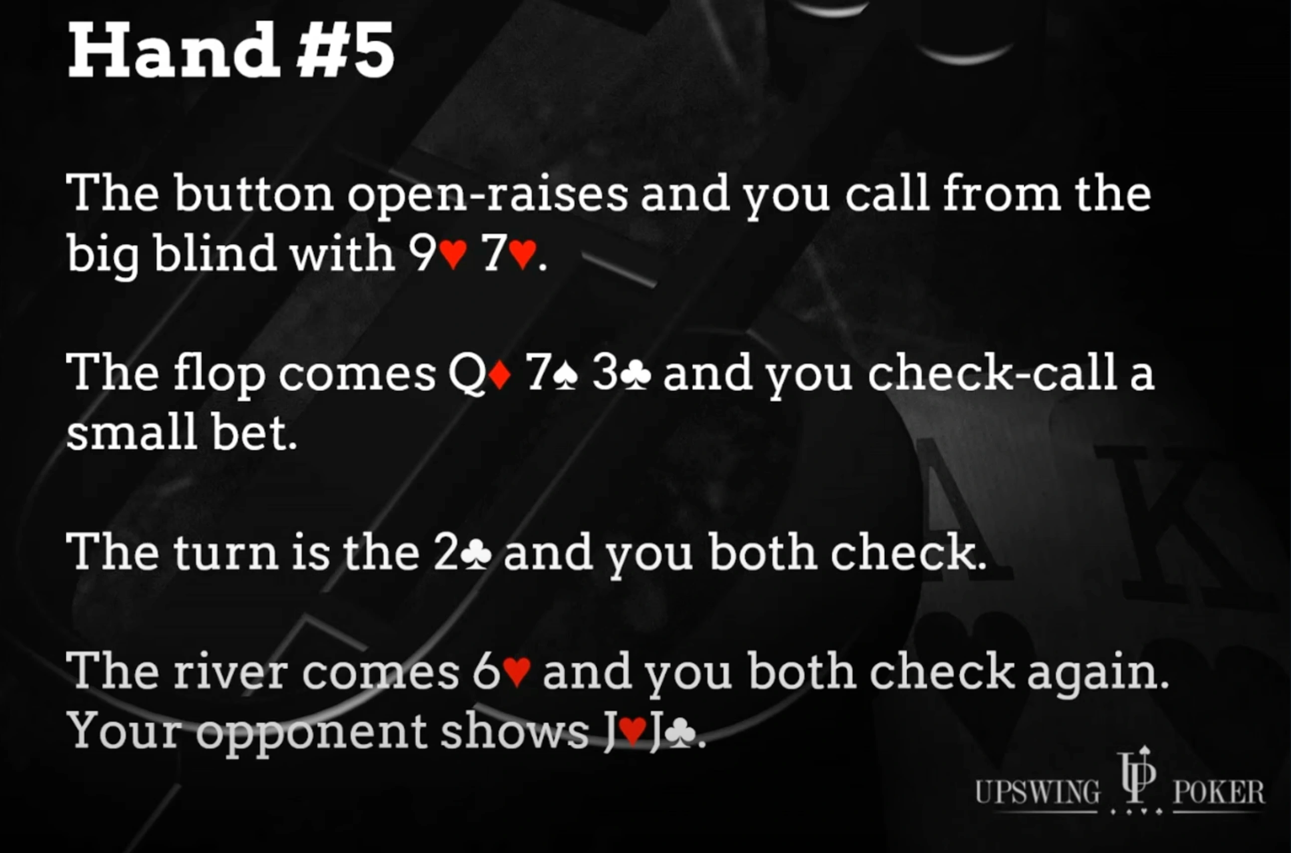 — again, you both check. You’re expecting to win with your middle pair, since only one small bet went in — but you’re surprised to see your opponent turn over