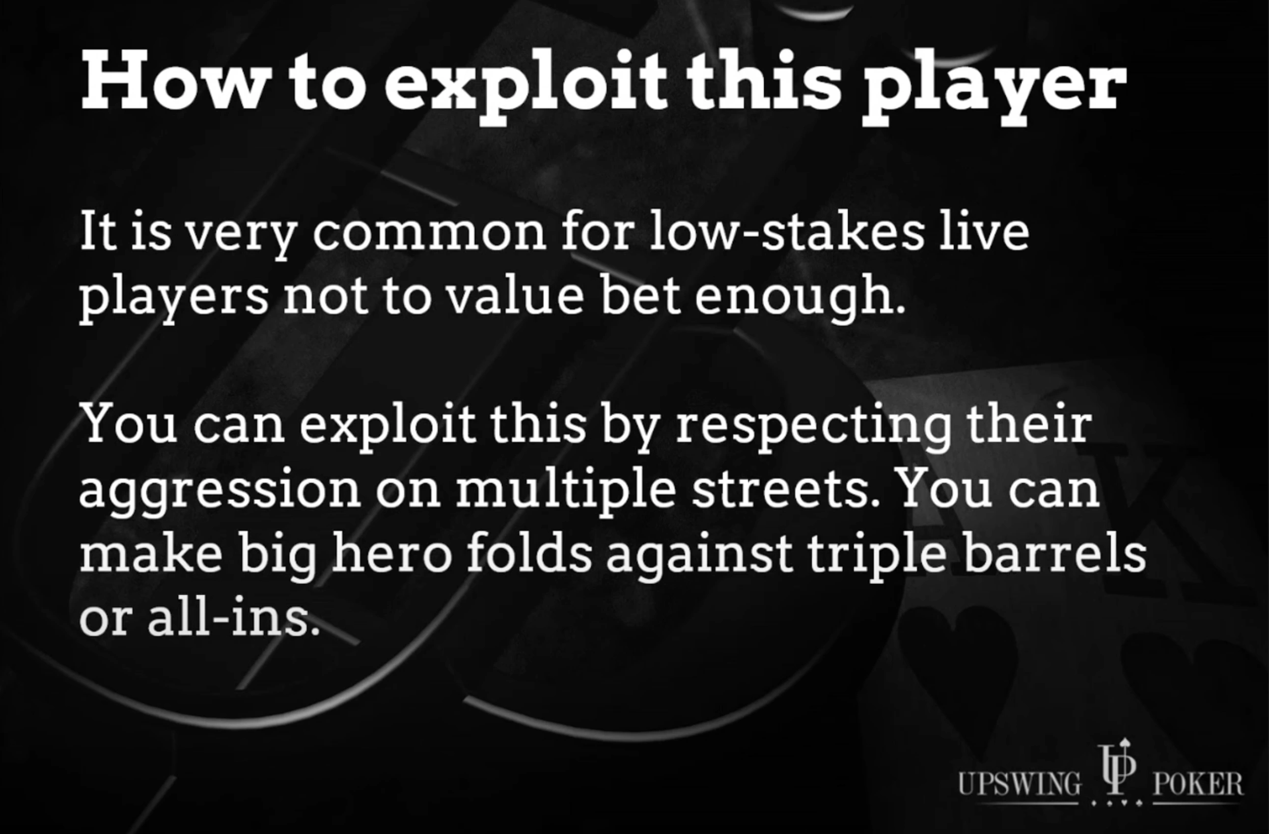 So, if this type of player triple-barrels into you... if they check-raise the flop... if they shove all-in on the river — you can start exploiting them by respecting that aggression. You can overfold on the river. You can make marginal folds on the turn. Overall — you tighten up, and continue less when these passive players suddenly start showing aggression.
