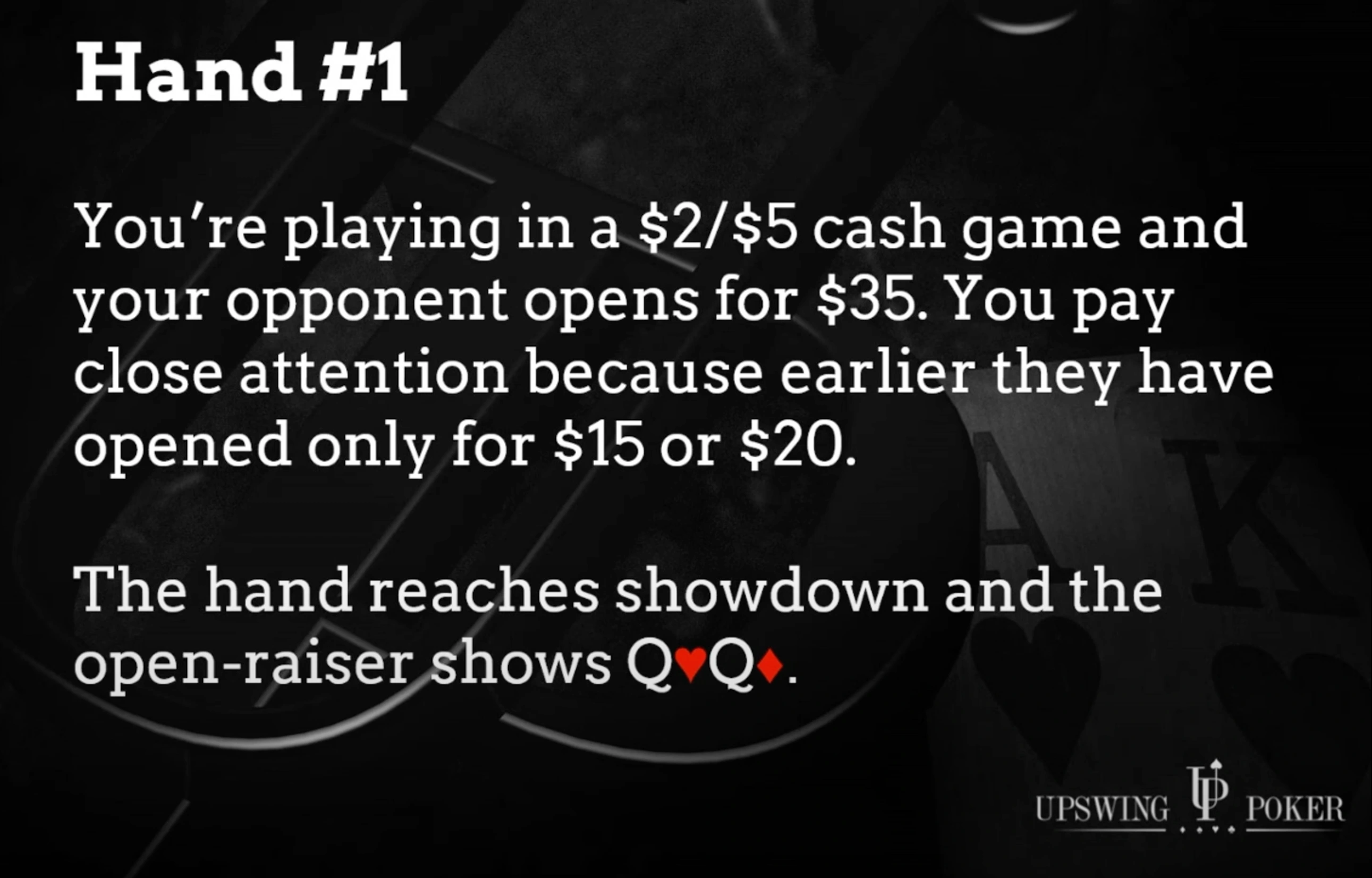 Here's hand number one: Suppose you're playing a NL2-NL5 cash game and a player open raises to $35 — that's a 7x raise. You notice this right away, especially because it's different from the $15 and $20 raises you saw this player make earlier. That player eventually reaches showdown with their $35 hand, and they turn out to have