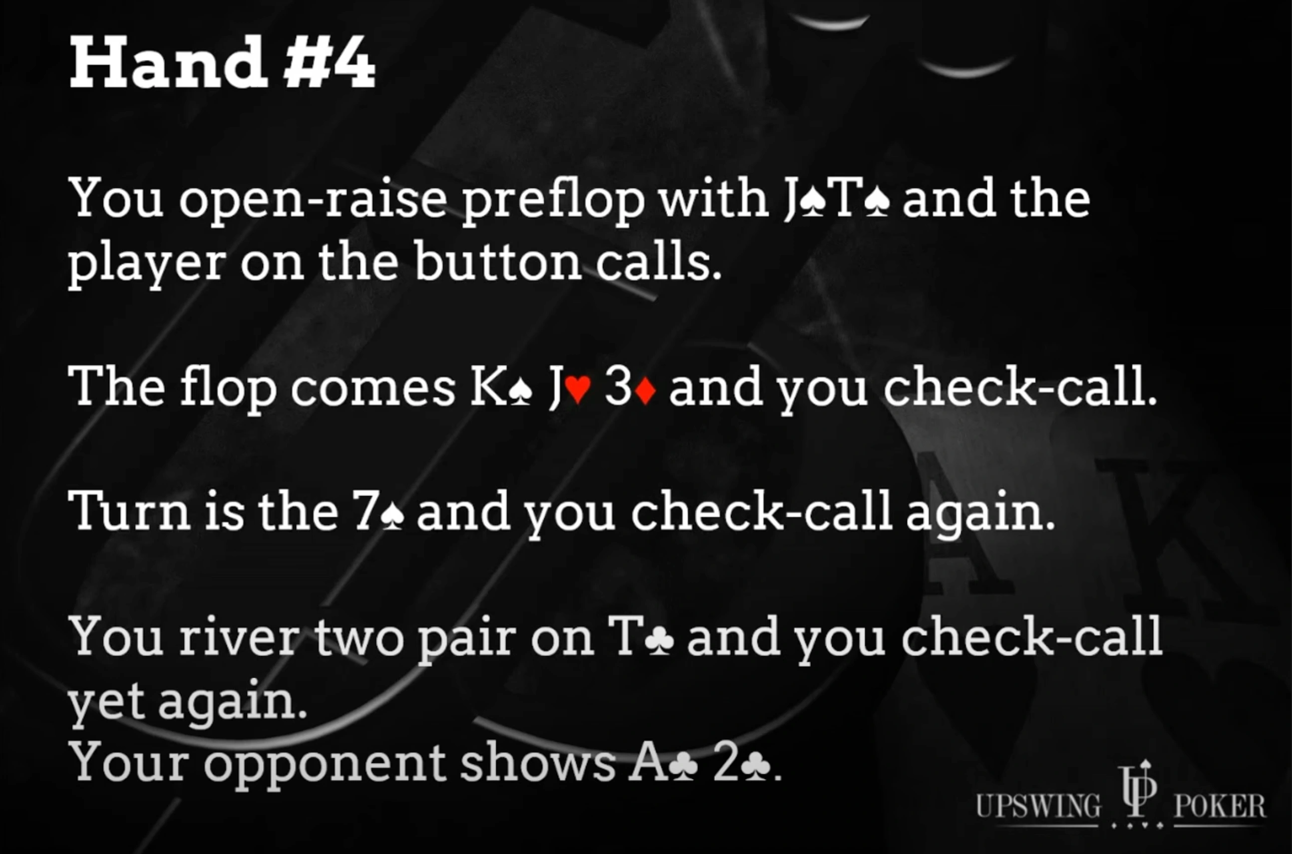 Let’s jump into hand number four. Suppose you raise preflop with a jack-ten of spades and a player on the button calls. The flop comes king-jack-three with one spade, and you check-call a bet from your opponent. The turn is the seven of spades, and you check-call again with your pair and flush draw. The river is a ten, giving you two pair — and you check-call yet another bet.