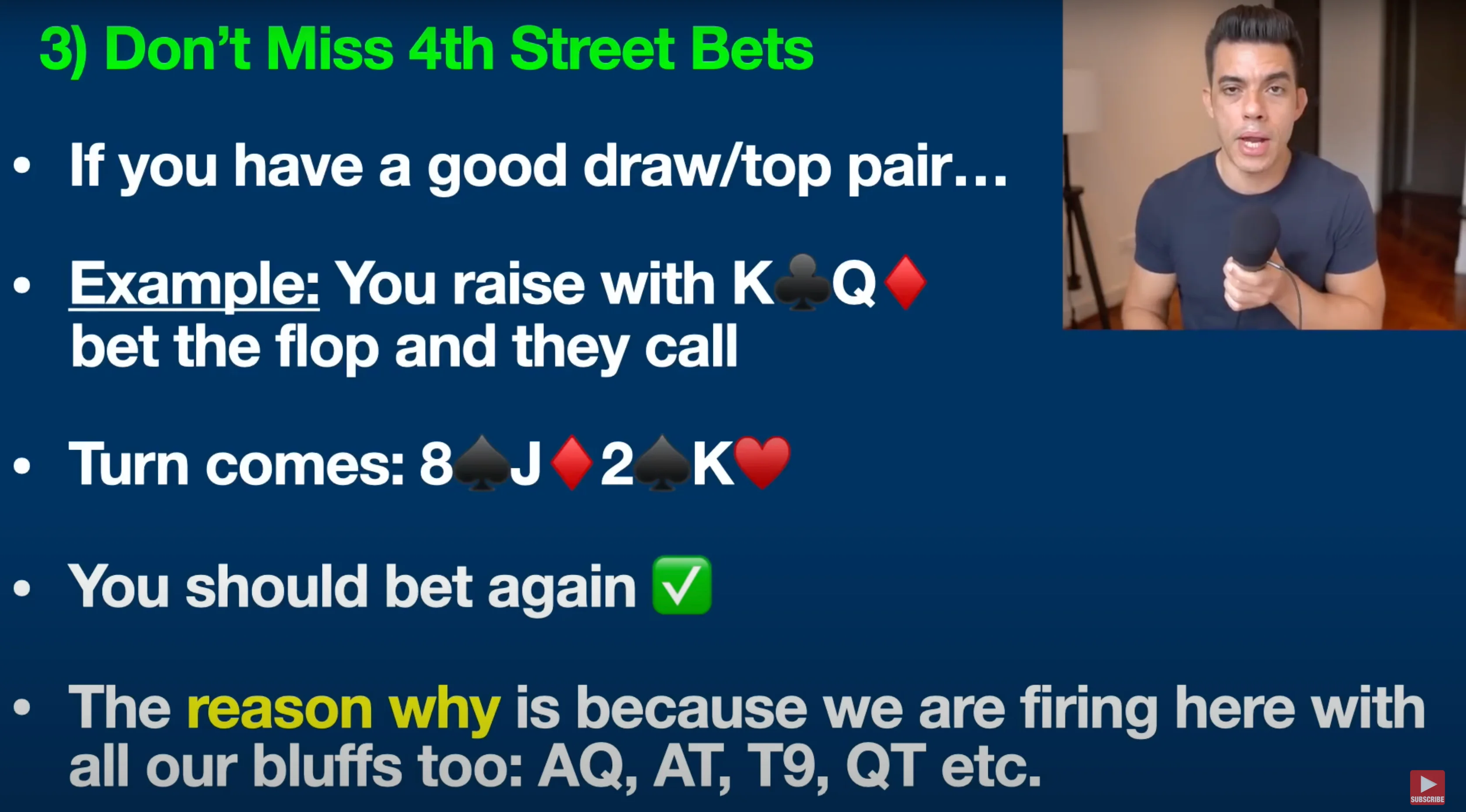 The next thing you need to know is: don’t miss your 4th street bets. So what’s Fourth Street? In poker, Fourth Street is another name for the turn. Here’s a quick rule of thumb: If you have a good draw or top pair, you should continue betting on the turn most of the time.