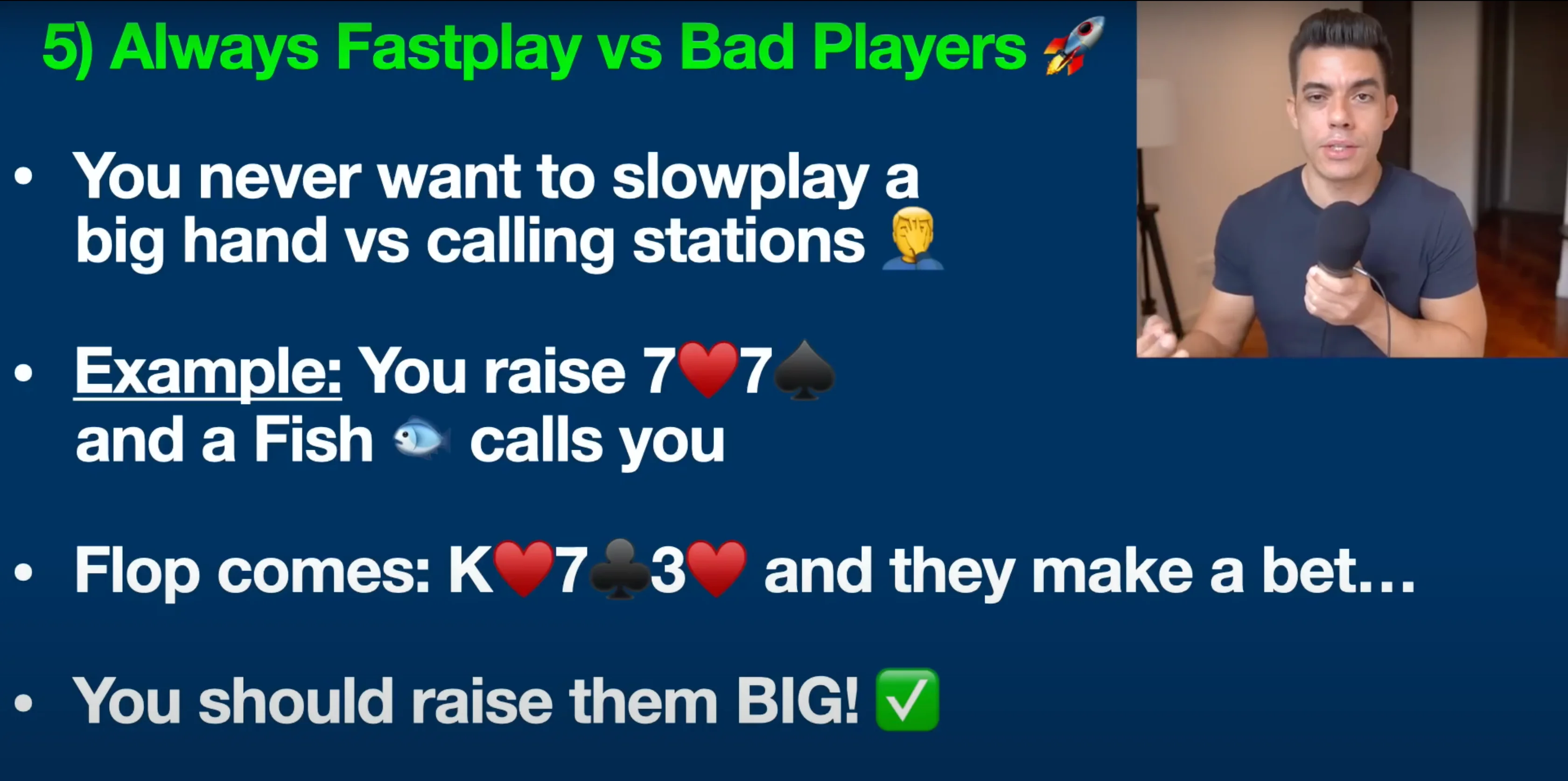 You’re costing yourself money by artificially keeping the pot size small with just a call. Takeaway: Always fast-play your strong hands against bad players. Raise big, and take advantage of their tendency to call with weaker hands.