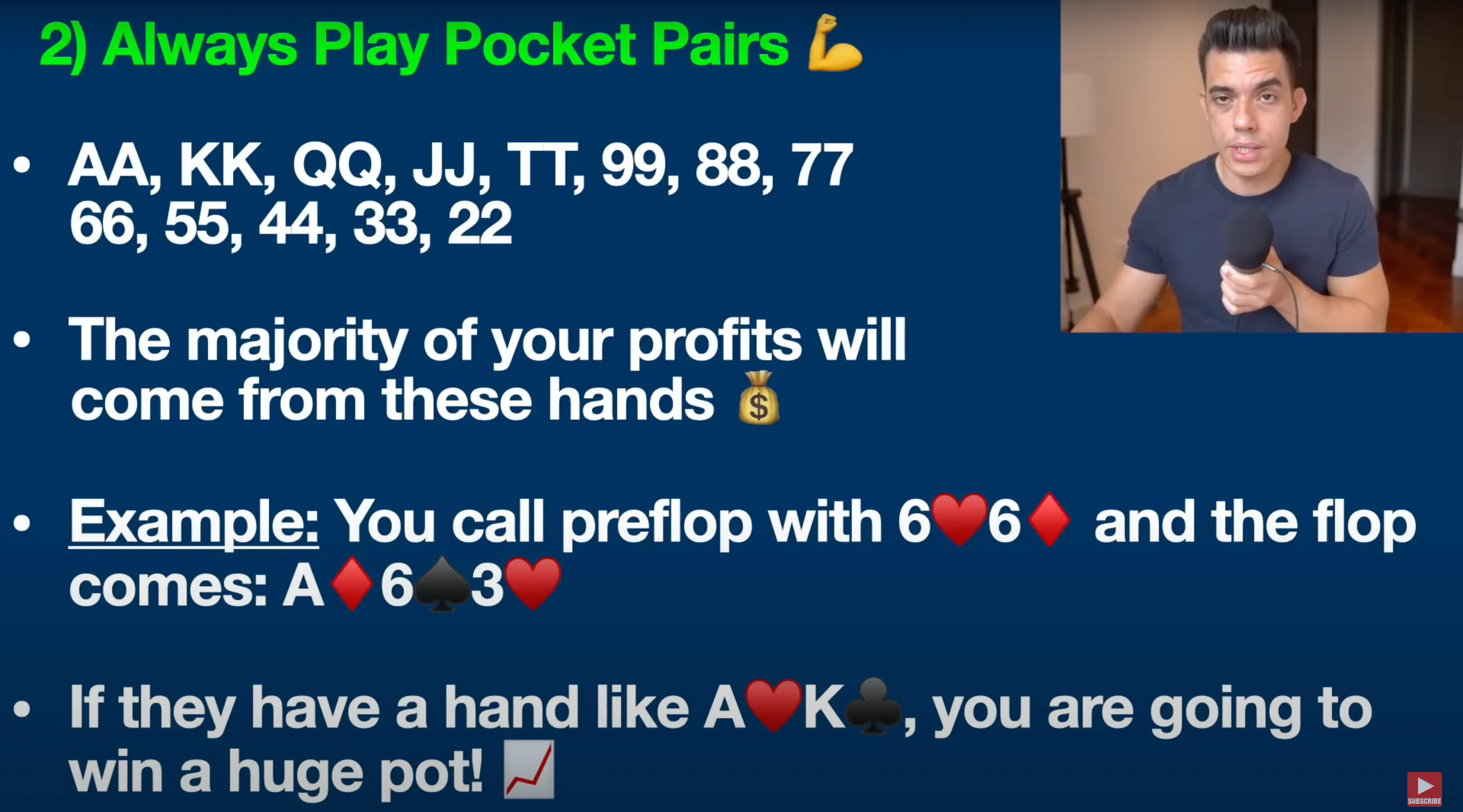 So, what’s the bottom line here? You need to play your pocket pairs in all situations. Of course, the big ones like pocket aces, pocket kings, and pocket queens should be raised or re-raised preflop. But even with smaller pocket pairs, you still want to give yourself a reason to get into the pot.