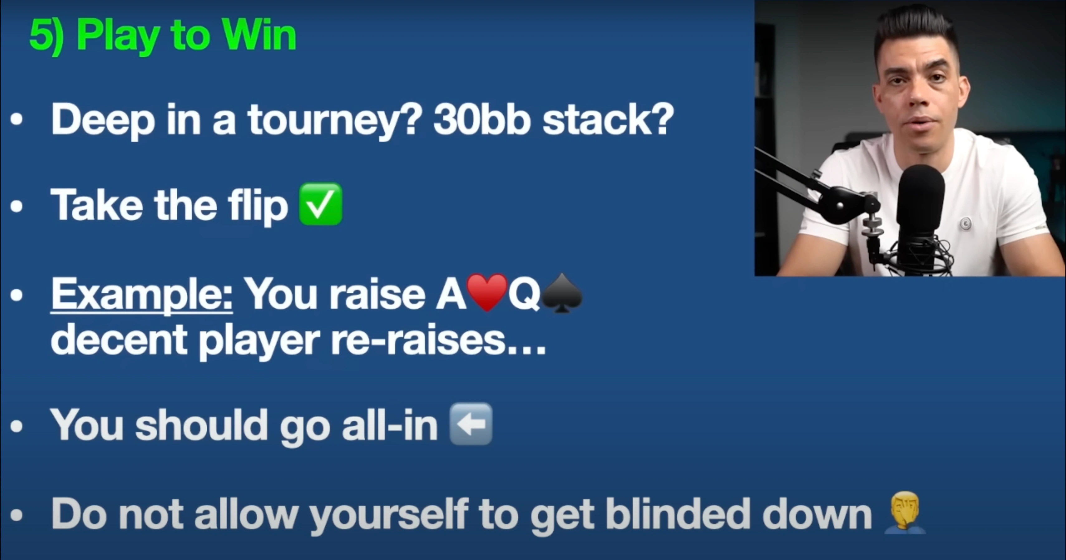Let’s talk about tournaments for a second here — because I know that a lot of you guys also play in tournaments. So let’s just say you’re deep — you’ve got a 30-big-blind stack. Guys, what you need to understand in a situation like this is: you must take the flip.