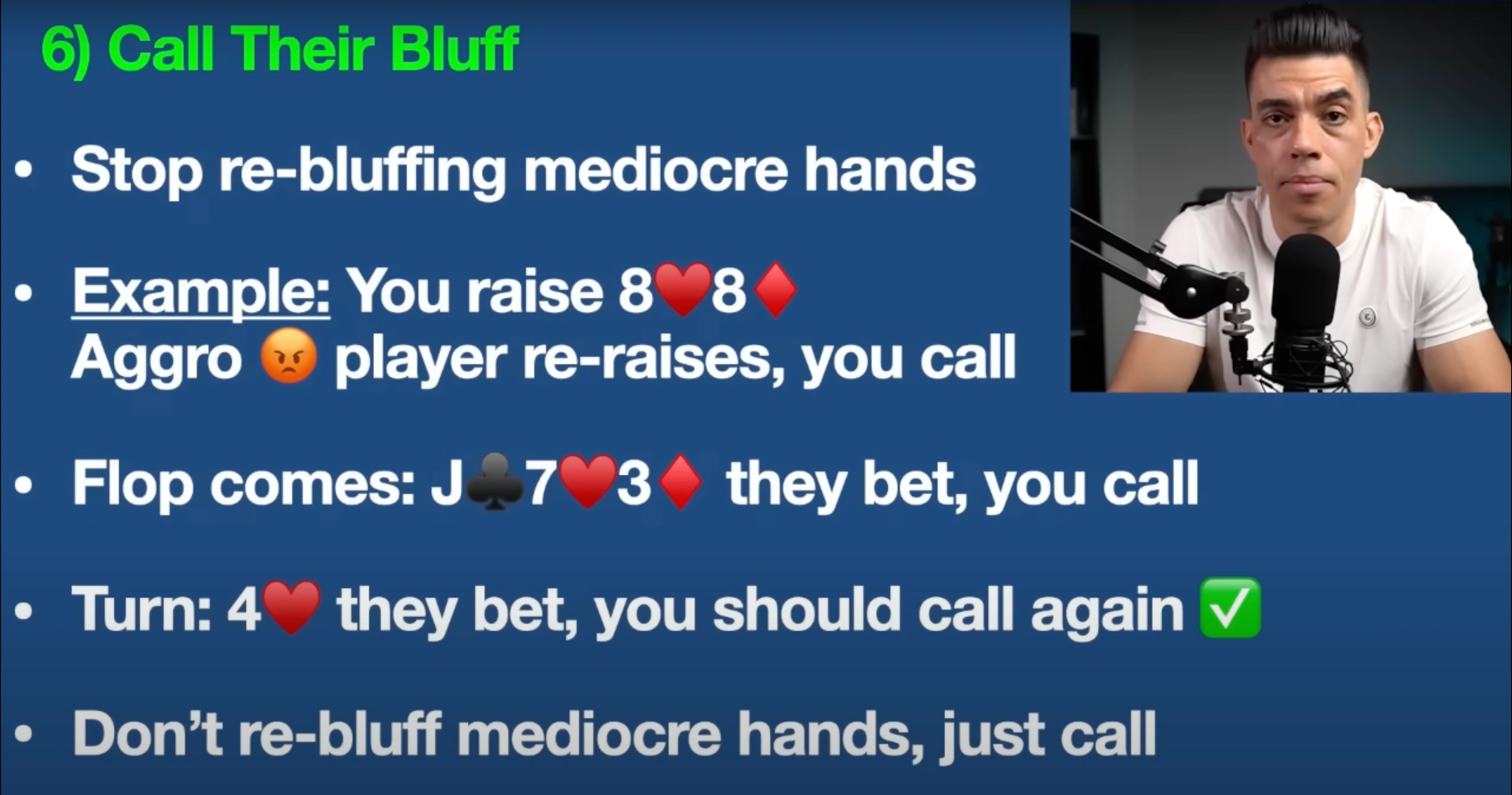 Guys, I’m just going to say this straight up — you need to stop rebluffing your mediocre hands. Let me give you an example: You raise it up with two eights, that’s the