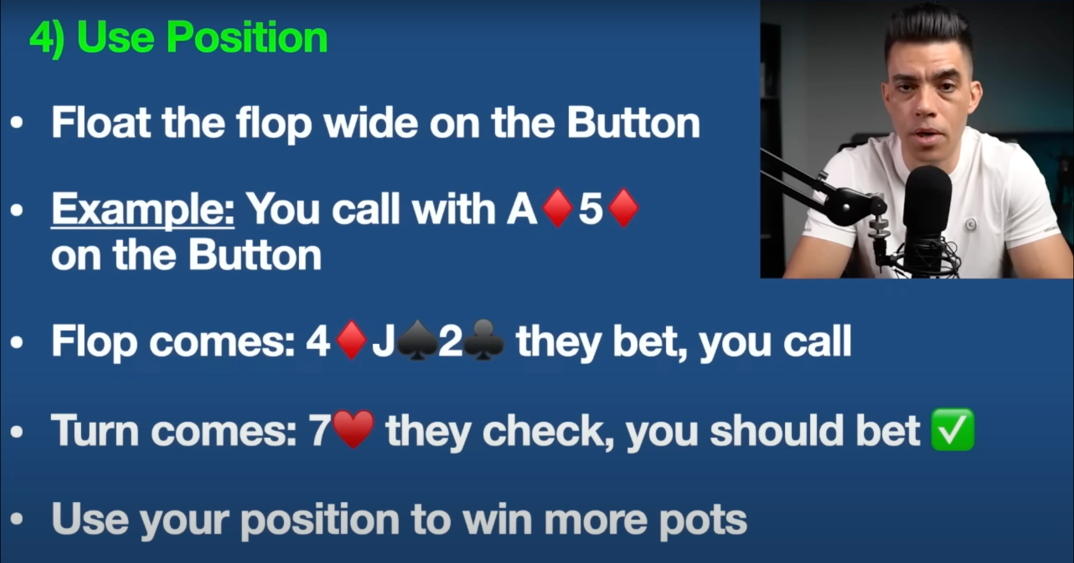 So you want to float the flop wide when you're on the button. And by the way, "floating" in poker — as I'm going to show you in the example coming up here — is just calling on the flop, even though we don't have much of anything, with the absolute intention to take away the pot later on the turn. And we're going to talk about that right now.