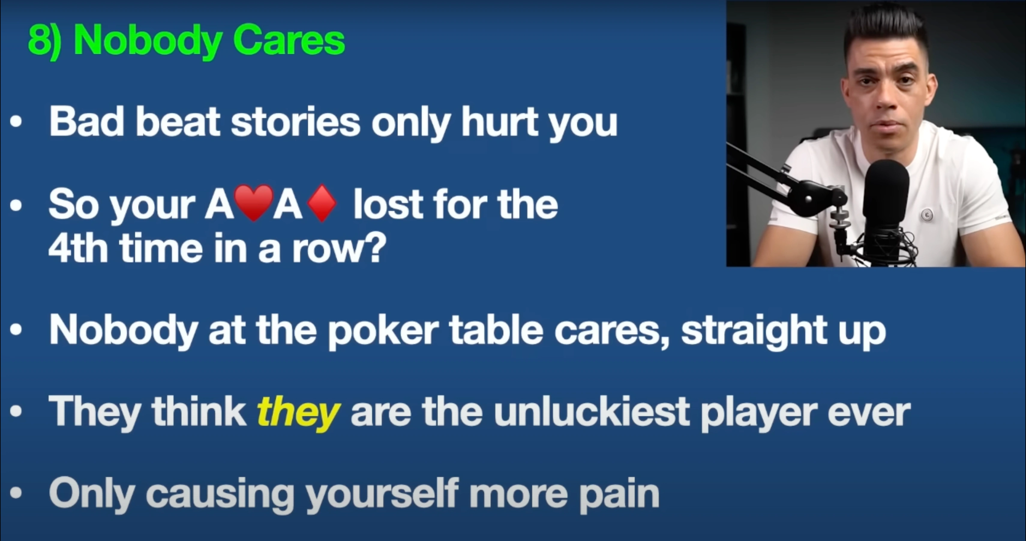 Guys — this is the brutal, cold, hard reality of poker: nobody cares about your bad beat stories. Poker is a single-player game. A lot of people get it twisted — they get confused — and think that somebody actually wants to hear about the fact that your pocket Aces lost for the fourth time in a row.