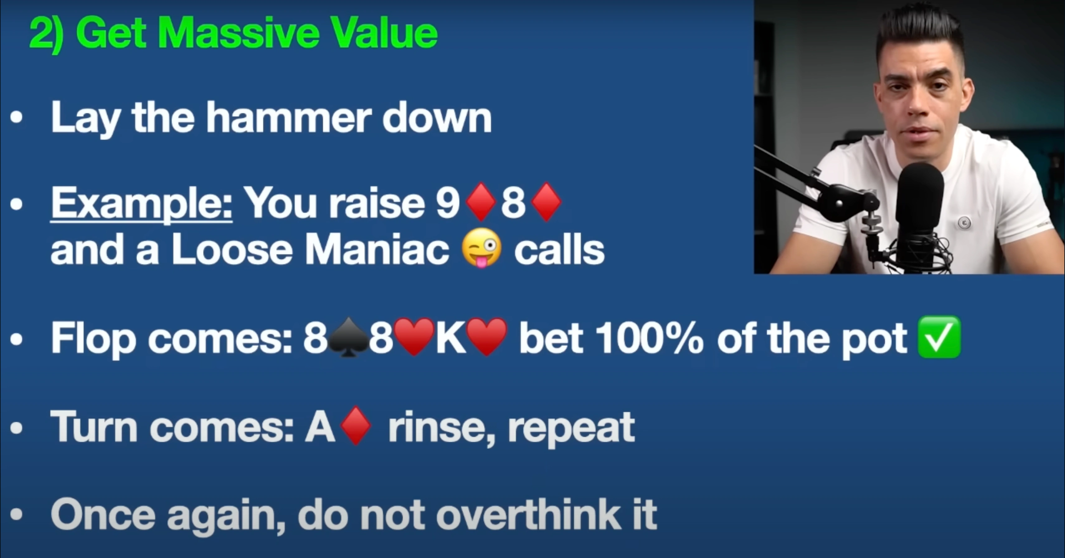 Turn comes down with the . Rinse, repeat — bet big. Once again, guys, do not overthink a very simple card game. Let them do that. When you hit a strong hand, bet a massive amount and thank me later.