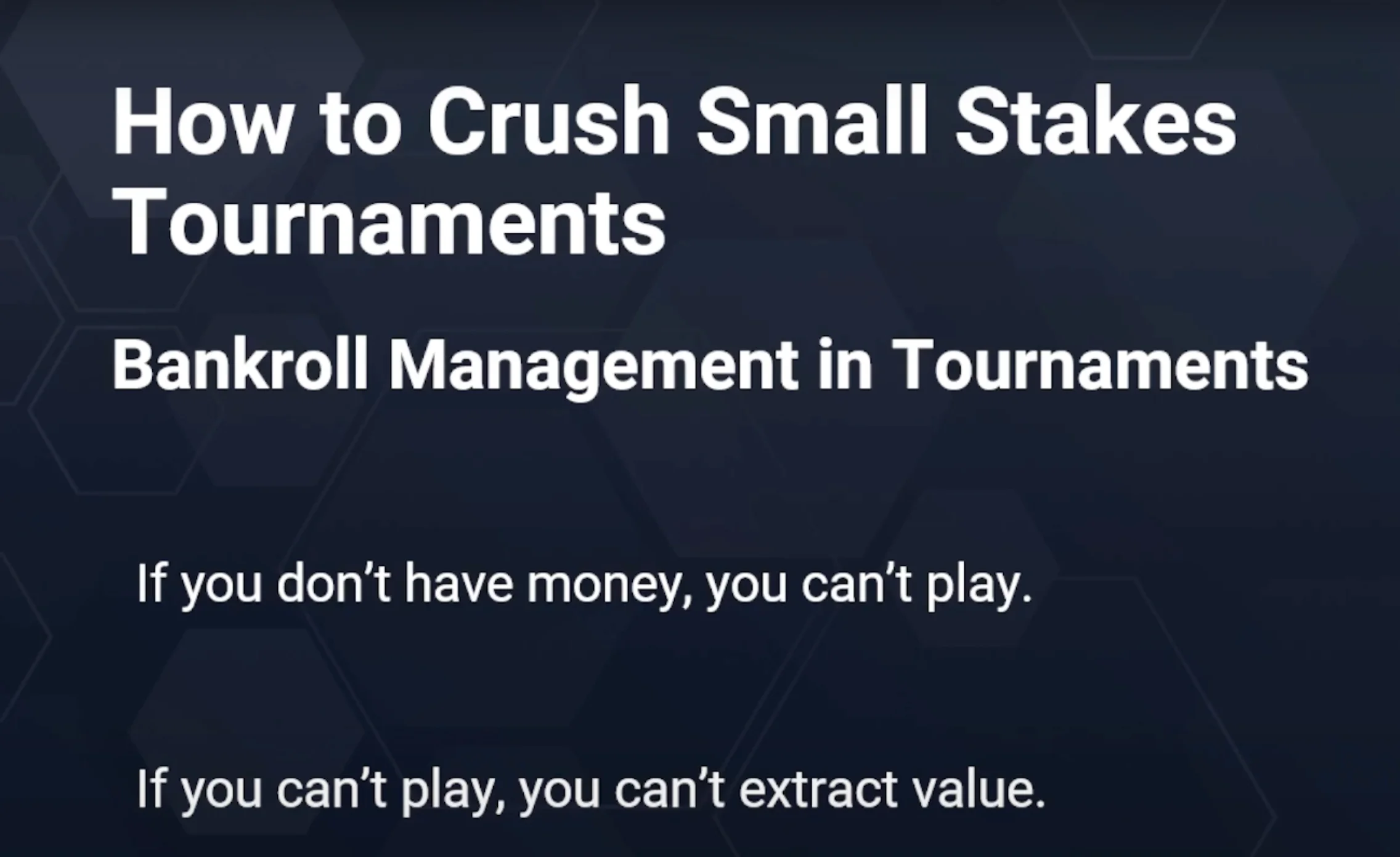 One of the biggest mistakes many players in small stakes tournaments make is not playing with a proper bankroll. Today, we will discuss bankroll management for poker tournaments. It's crucial to understand that if you don't have money in your bankroll to play poker, you can't play. And if you can't play, you can't extract value and grow your bankroll. To win at poker, you need to do only three things, which might sound easy:
