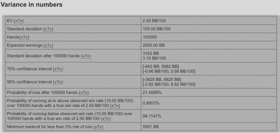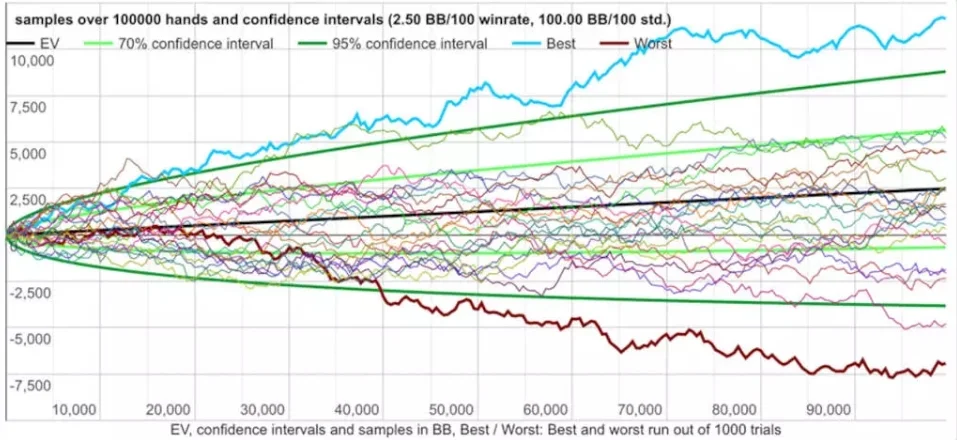 At a win rate of 2.5bb/100, you’d need a bankroll of around 6,000 big blinds to avoid going broke. If you were playing NL100 (with a $100 buy-in and $1 big blind), that means you'd need a $6,000 bankroll.