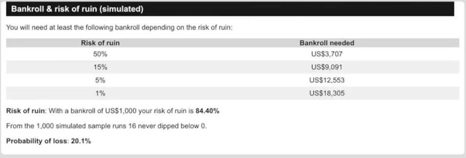 Here’s another simulation by Primedope — this time, it’s a $100 tournament played 1,000 times with a 10% ROI (return on investment). A 10% ROI is considered a strong win rate for tournament players. As you can see, the bankroll required to reduce the risk of going broke is twice as large as what a cash game player would need.