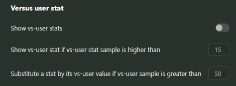 - Show vs-user stat if vs-user stat sample is higher than X - sets the sampling threshold for showing "vs-Hero" statistics next to the main one. If the number of hands against you is greater than this value, H2N will show the "vs-Hero" number next to the usual statistical value. This prevents unreliable data from being displayed - "vs-Hero" will appear only with a sufficient number of hands.