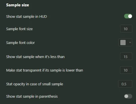 - Sample font color - the font color for the number of statistics being sampled. By default, the selection can be semi-transparent or lighter than the main text. You can set any color to make it more visible or stylize it to match the overall color scheme of the HUD.