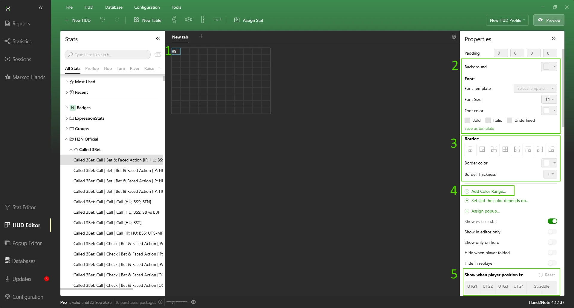 When you hover over the stat (1), the program displays all its information. You can configure background color, font, stat size, background (2), border (3), color ranges (4), and display conditions (5) in the right menu.