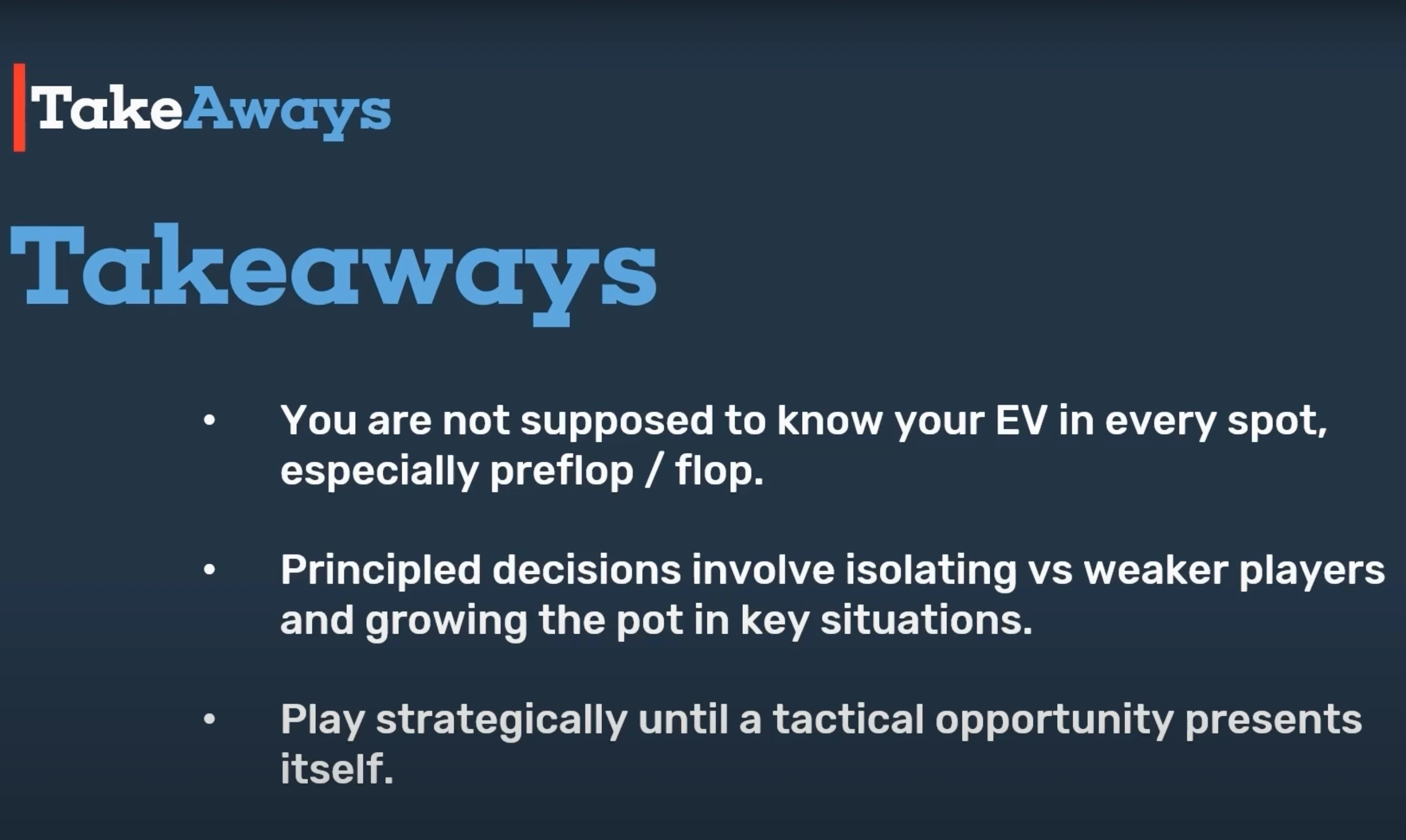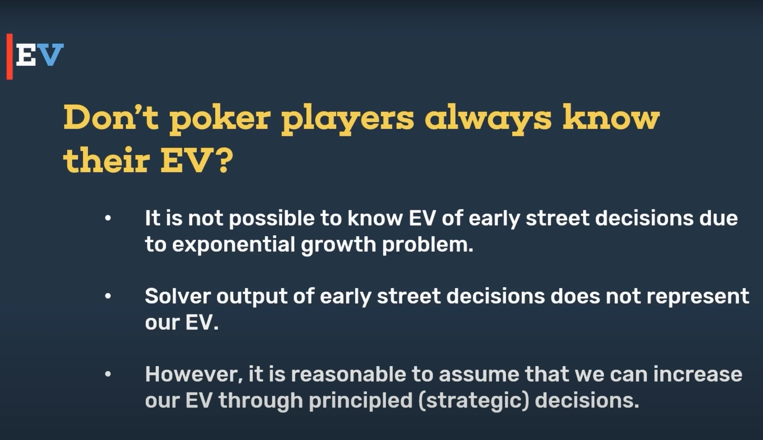 Let’s wrap this up with a few important insights from the discussion. First and foremost: You’re not supposed to know your exact EV in every situation. Yes, strong players might seem like they always know their EV — but in reality, it’s virtually impossible to calculate precise EV on early streets, especially preflop and flop.