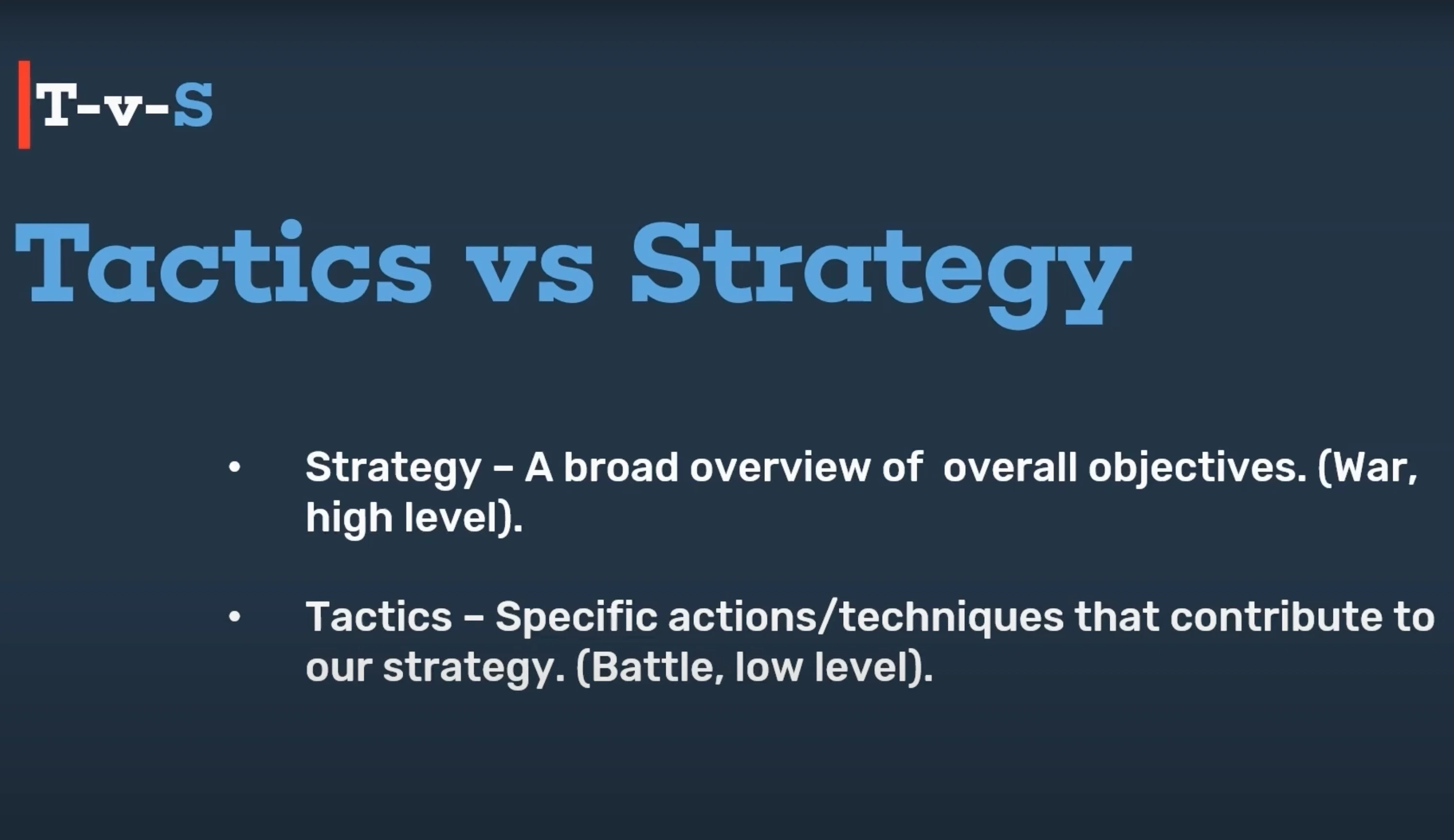 - The individual battles you fight to win it? That’s tactics.