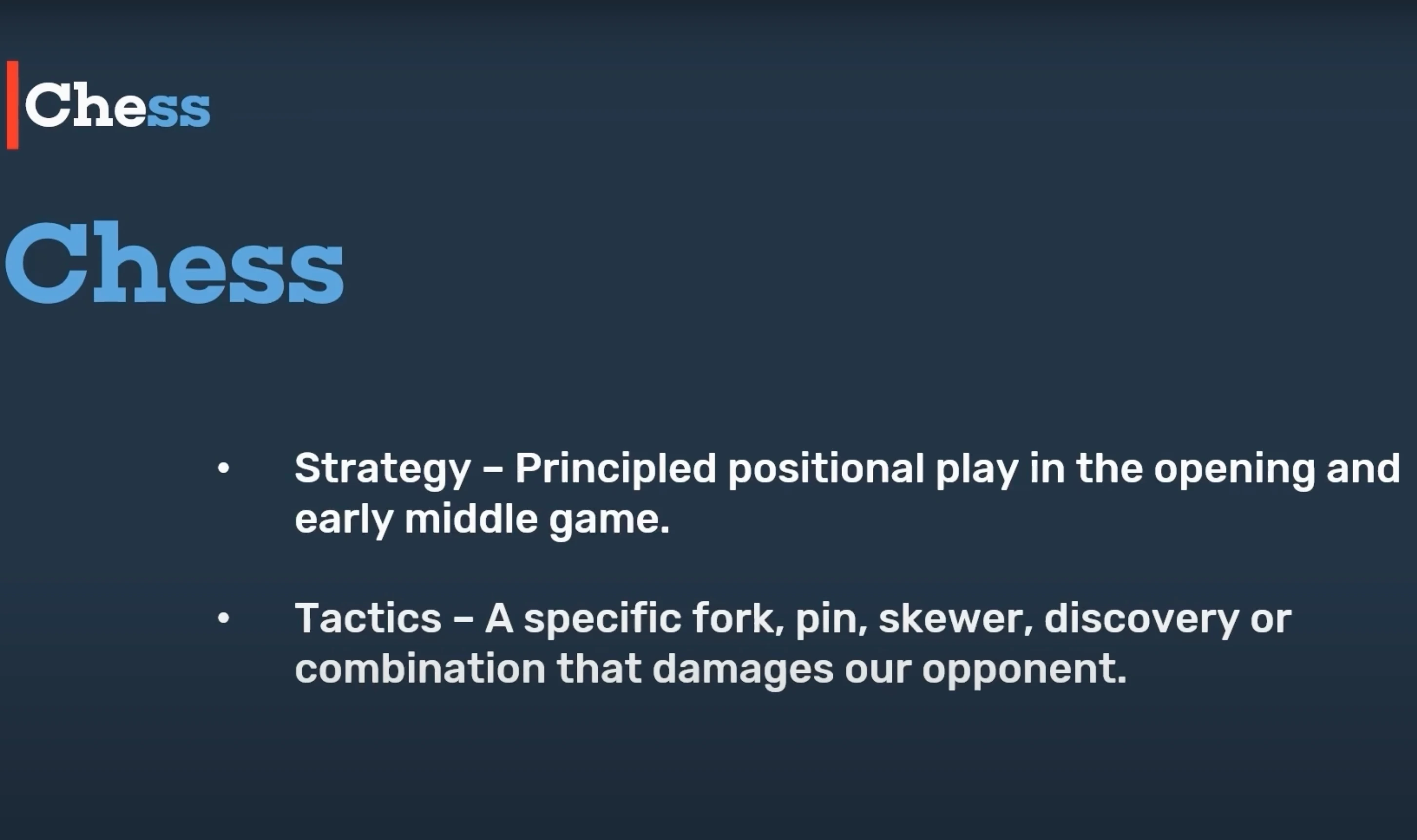 In chess, just like in war or poker, strategy refers to the overall plan. A good example? Principled positional play during the opening and early middle game.