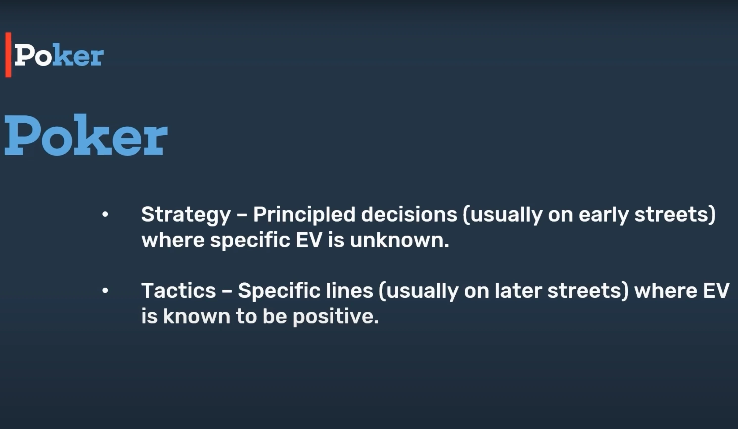 So are we flying blind on early streets? Absolutely not. This is where strategy comes in. Even though we can’t precisely calculate our EV preflop or on the flop in many cases, we can still rely on strategic principles — built on experience, heuristics, and theory — to guide our play.