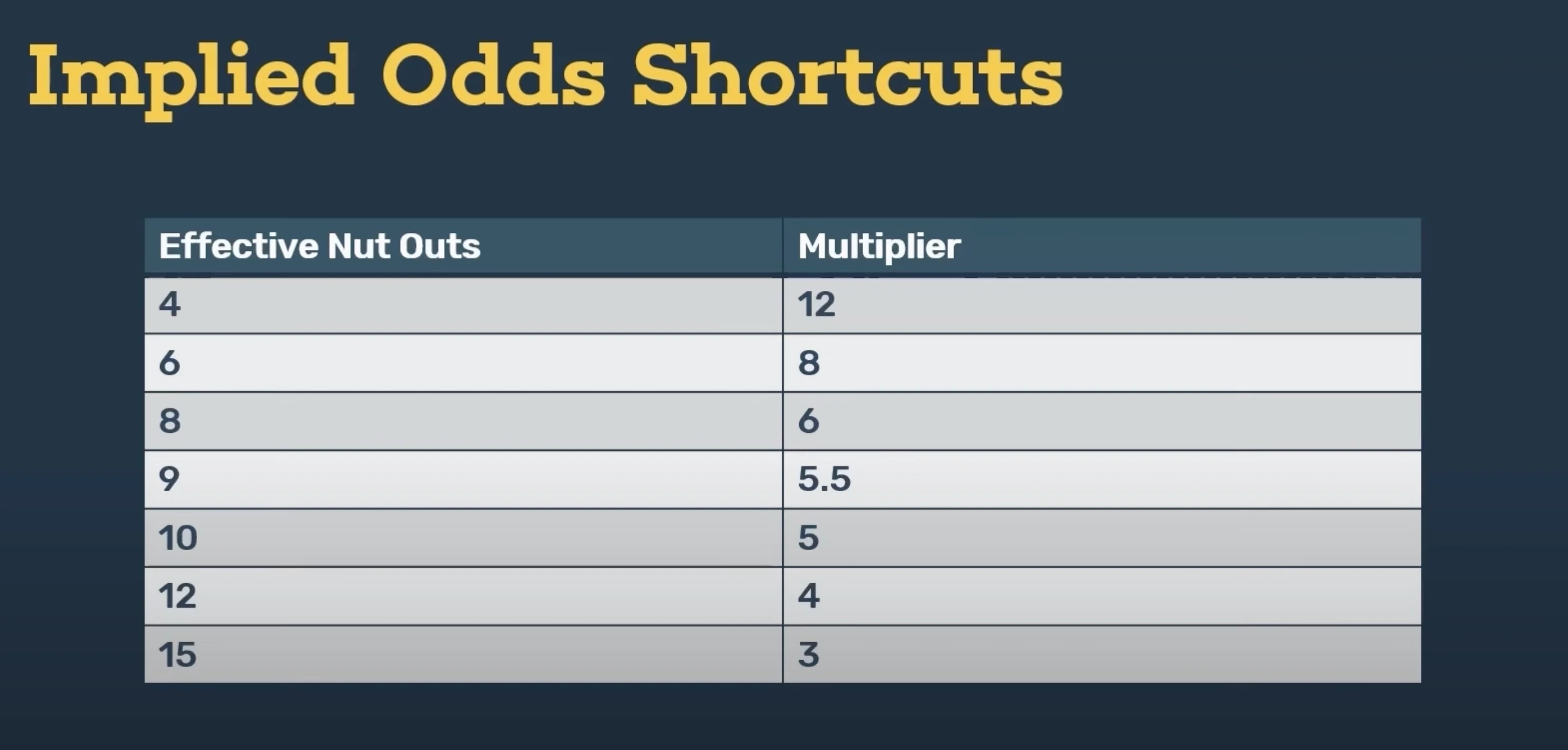How did we streamline the math? By putting in a little work pre-hand to memorize some essential values — these are your implied odds shortcuts.