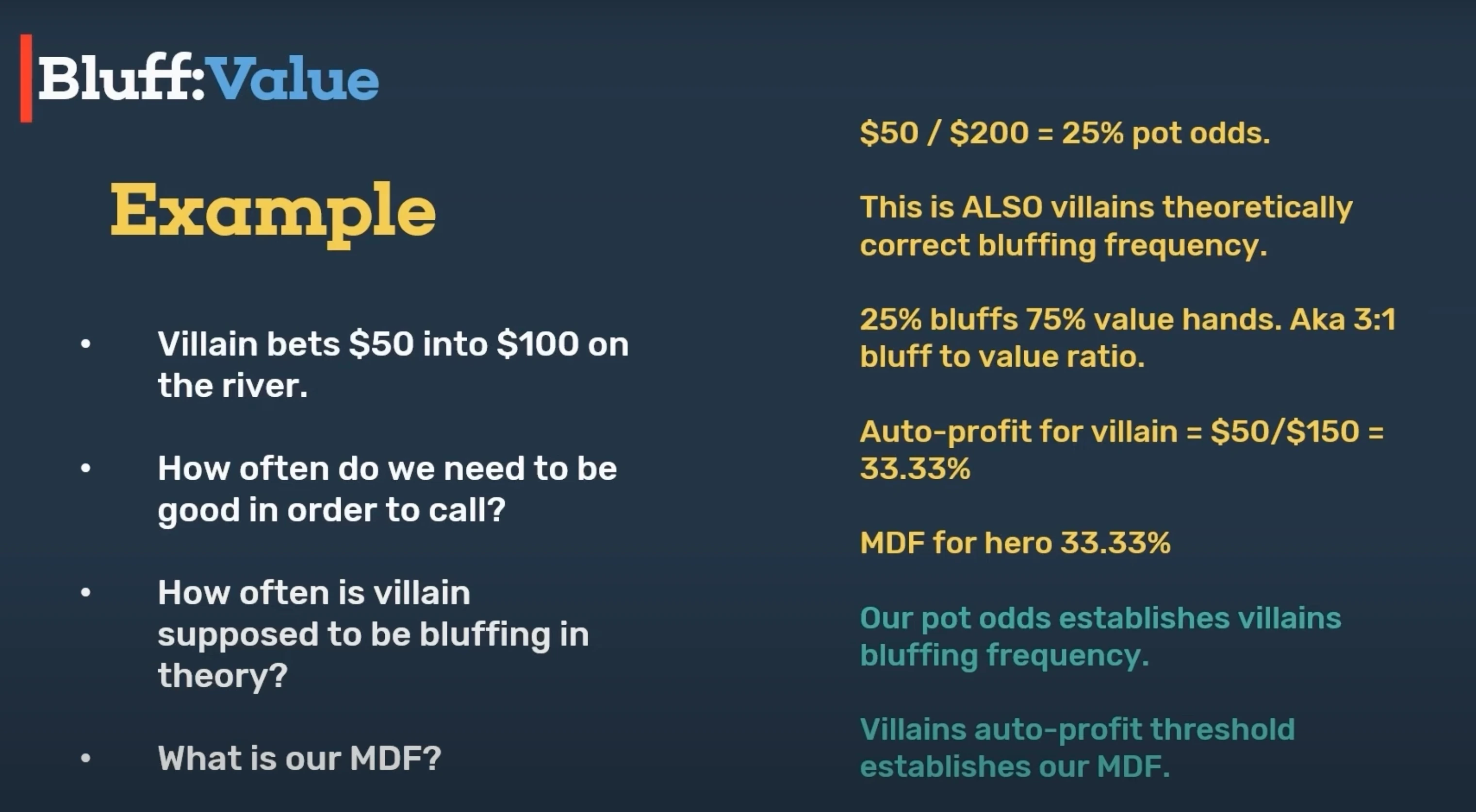 Now we might miss that fact if we were referring to Valens bluff to value ratio as 3 to 1, but now everything's a percentage. 25% pot odds, that's also Valens correct bluffing frequency when firing the river. The next question, what is our MDF? Now the reason why I'm asking this question is just so you can see how the math also links together in a secondary as well. There's a link between our minimum defense frequency and the autoprofit threshold on our opponent's bet. So let's start with our opponent's autoprofit threshold.