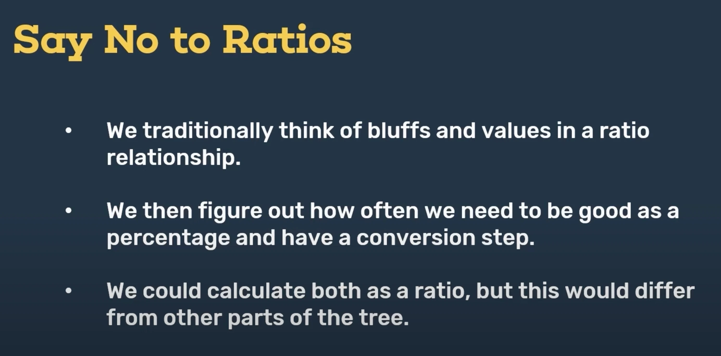 But one of the key takeaways from this podcast episode is that we can pretty much say no to ratios at every point of any calculation in poker. In fact, I'll probably get that printed on a t-shirt — say no to ratios. So we traditionally think of bluffs and value hands, the proportion in terms of the number of bluffs for each value hand; we think about that as being a ratio traditionally.