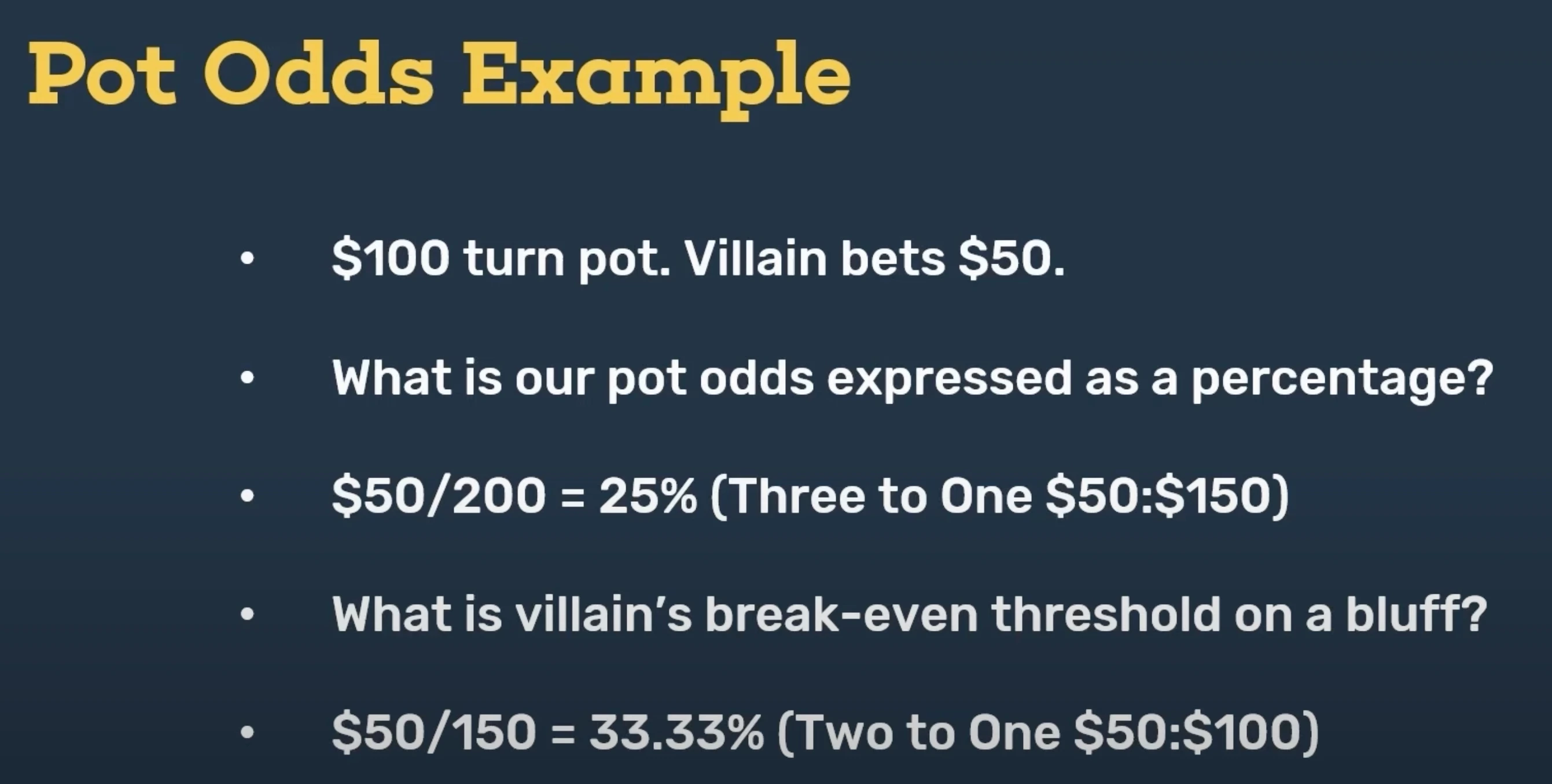 What is villain's breakeven threshold on a bluff? Well, there's a hundred in the pot on the turn. Villain bets fifty dollars. Remember, we said that for using the percentage calculation, we assume that the player's investment is now part of the pot as well.