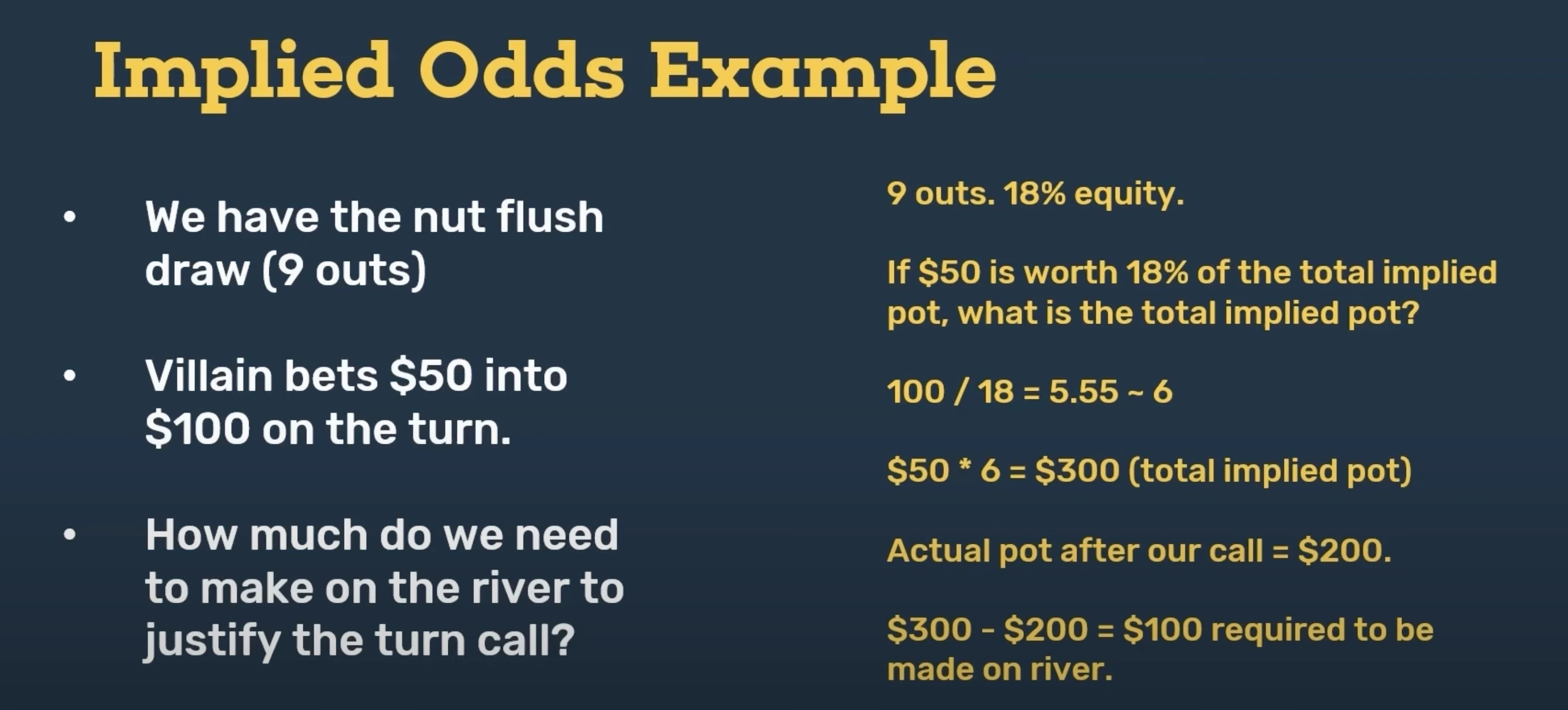 - This means the pot would need to be $300 in total to justify a direct pot odds call on the turn.