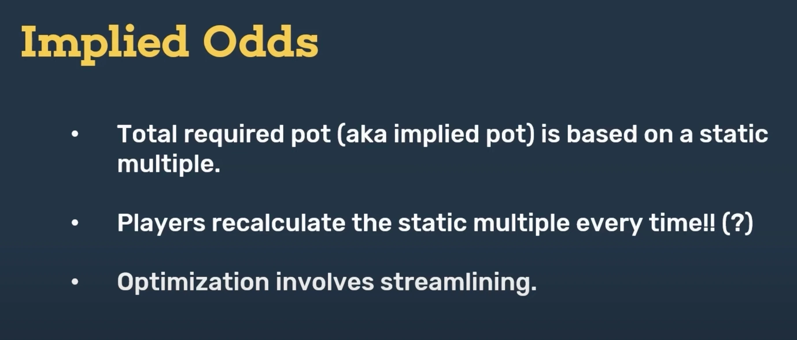 Certainly, with those first two — pot odds and implied odds — they are part of the core syllabus for any poker player. These are concepts that we visit on day one of being a poker player. How do pot odds work? How do implied odds work? And yet, the way that it's taught is not streamlined. It doesn't necessarily make sense.