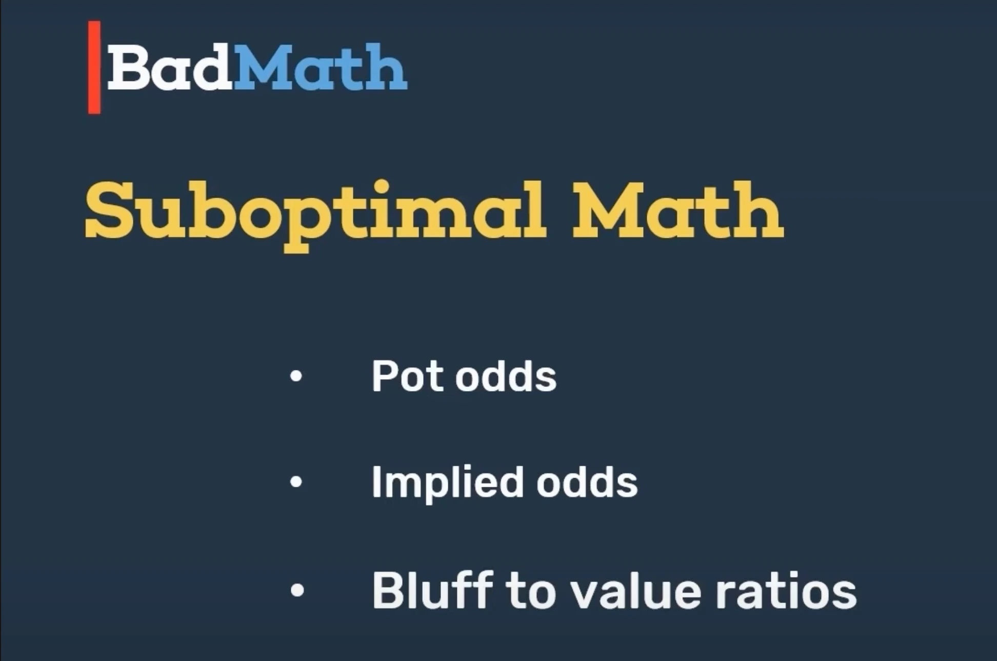 Poker players have a tendency to use math in a way that is suboptimal, and part of the reason why they do it is simply based on something that's nothing more interesting than tradition itself. We're going to think about the ways that poker players use math suboptimally in the following areas: pot odds, implied odds, and bluff-to-value ratios.
