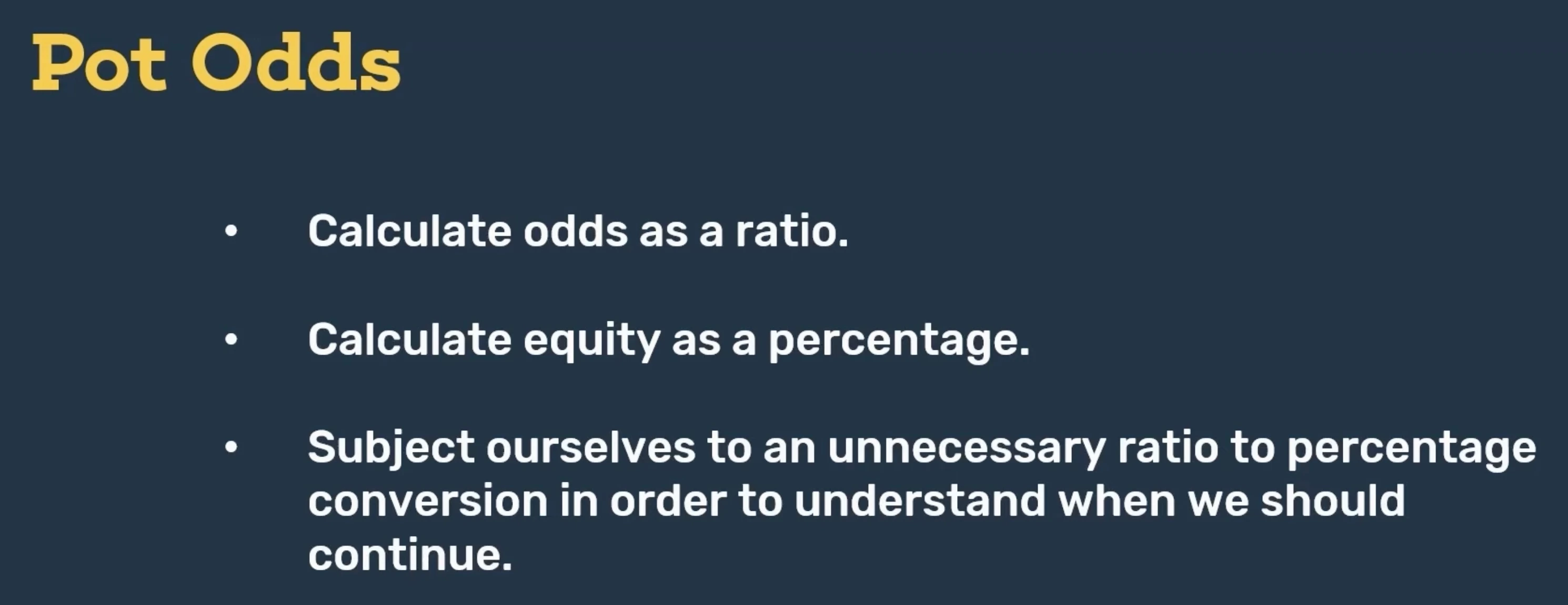 So the next part of the process in determining whether we have a call is to convert our ratio to a percentage. But here's the logical question: why are we calculating our odds as a ratio to begin with, knowing that we ultimately need it as a percentage? What's stopping us from just calculating our pot odds as a percentage, which we can then directly compare to our pot equity, which is also a percentage? And the answer is — nothing.