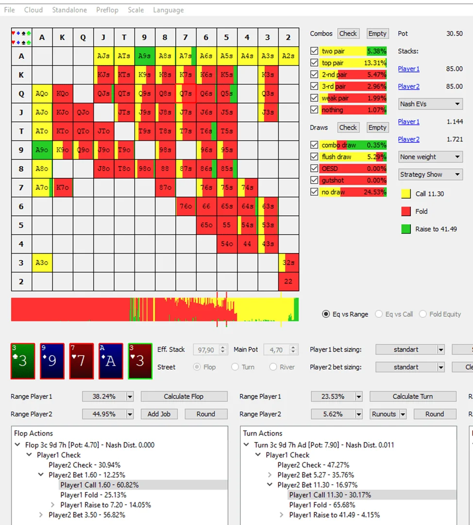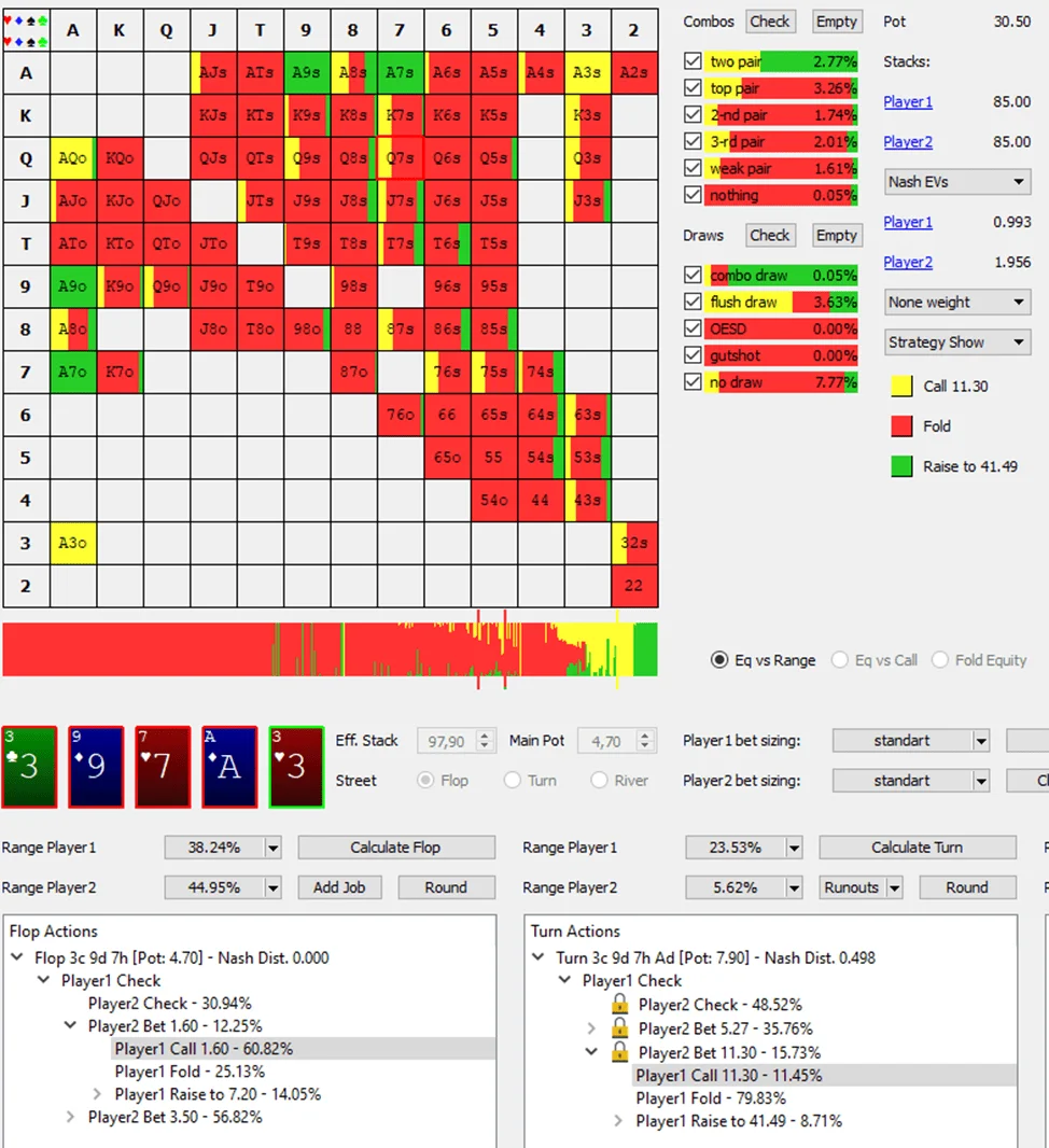 We can find a number of unorthodox (at first glance) solutions here. In addition to obvious value bets with varying equity and bluffs with draw hands there are also plenty of polarized bluffs (no made hands without draws in the screenshot above). In other words, the balanced defense strategy will be useful only against the balanced betting range.