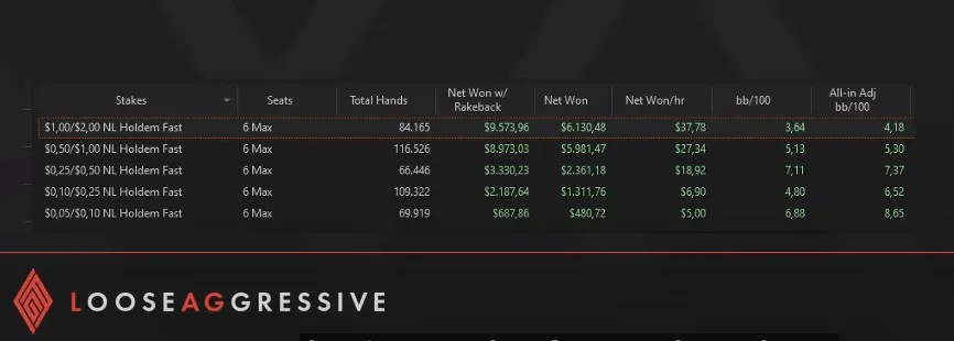 So here you see the results in this sample: you see the Net Won per hour and we'll add here the rakeback a bit later, which of course was not counted in the in the basic sample of Net Won per hour. You can see here that I will go stake by stake to give you a look at how much you can expect to earn as a winning regular at the stakes, at least with my winrate. But again we don't know how to reiterate it.
