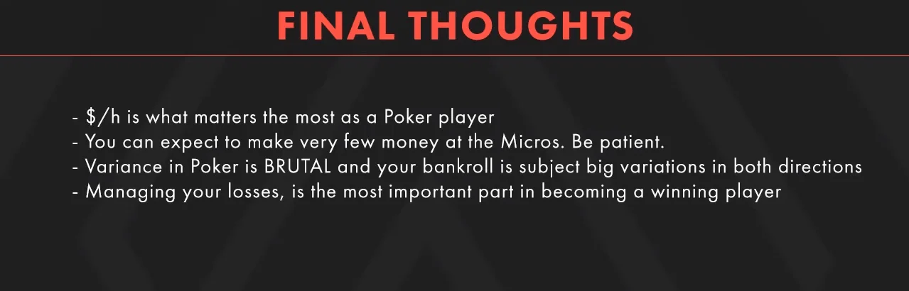 It's okay that I chose to sacrifice part of my profit to have a better life-work balance. It's not right or wrong - it's all about your personal priorities. I didn't play 6 hours per day, but an average of 3hours per day, and as such I was really never tired while playing, which definitely boosted my winrate. When you hit this number again, don't forget that variance from month to month can have a huge impact on your results, so the numbers I gave you are just an average by keeping this kind of winrates, but month by month you will see huge differences. So be prepared for it.