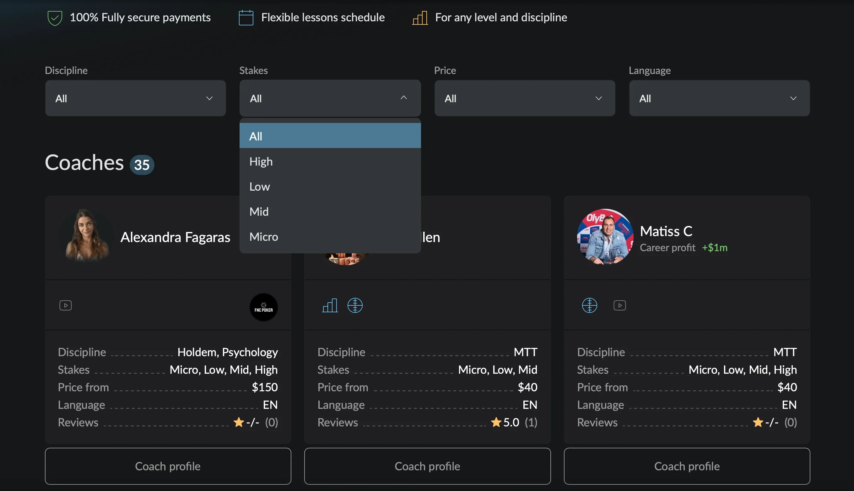 You can find a poker mentor in our Coaches section. Use filters to narrow down options by game format and pricing, then check student reviews to find the right fit for your needs on how to become a pro poker player and achieve all of your goals.