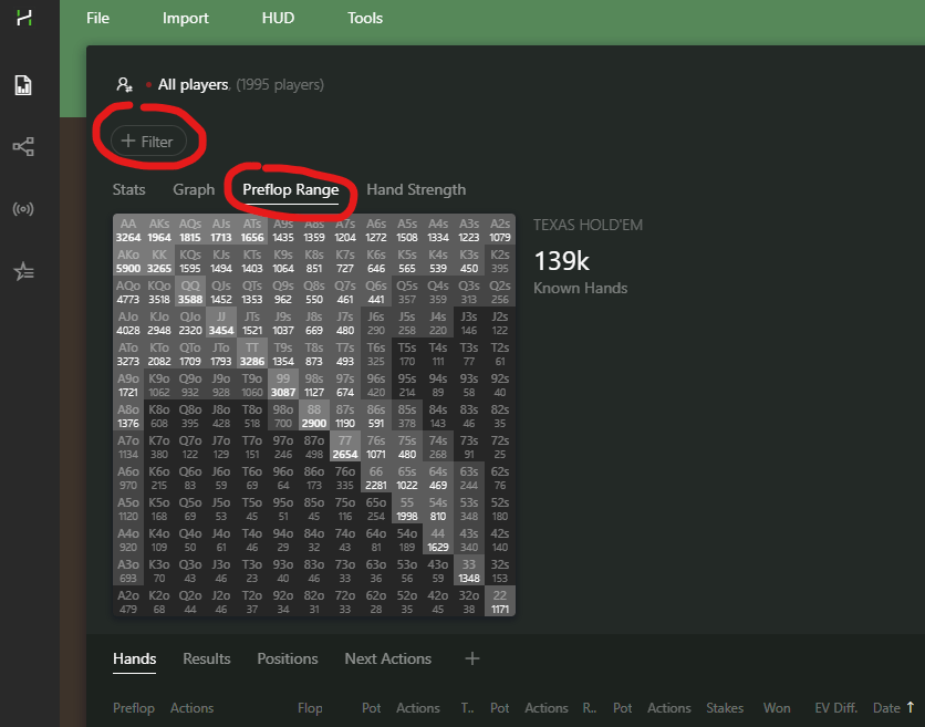 Now we see stats for the player group we selected. What we want to look at is the preflop ranges. So we’ll click on “Preflop Range”. And now, we’ll need to filter the spots we want to analyze one after another by clicking on “Filter”.