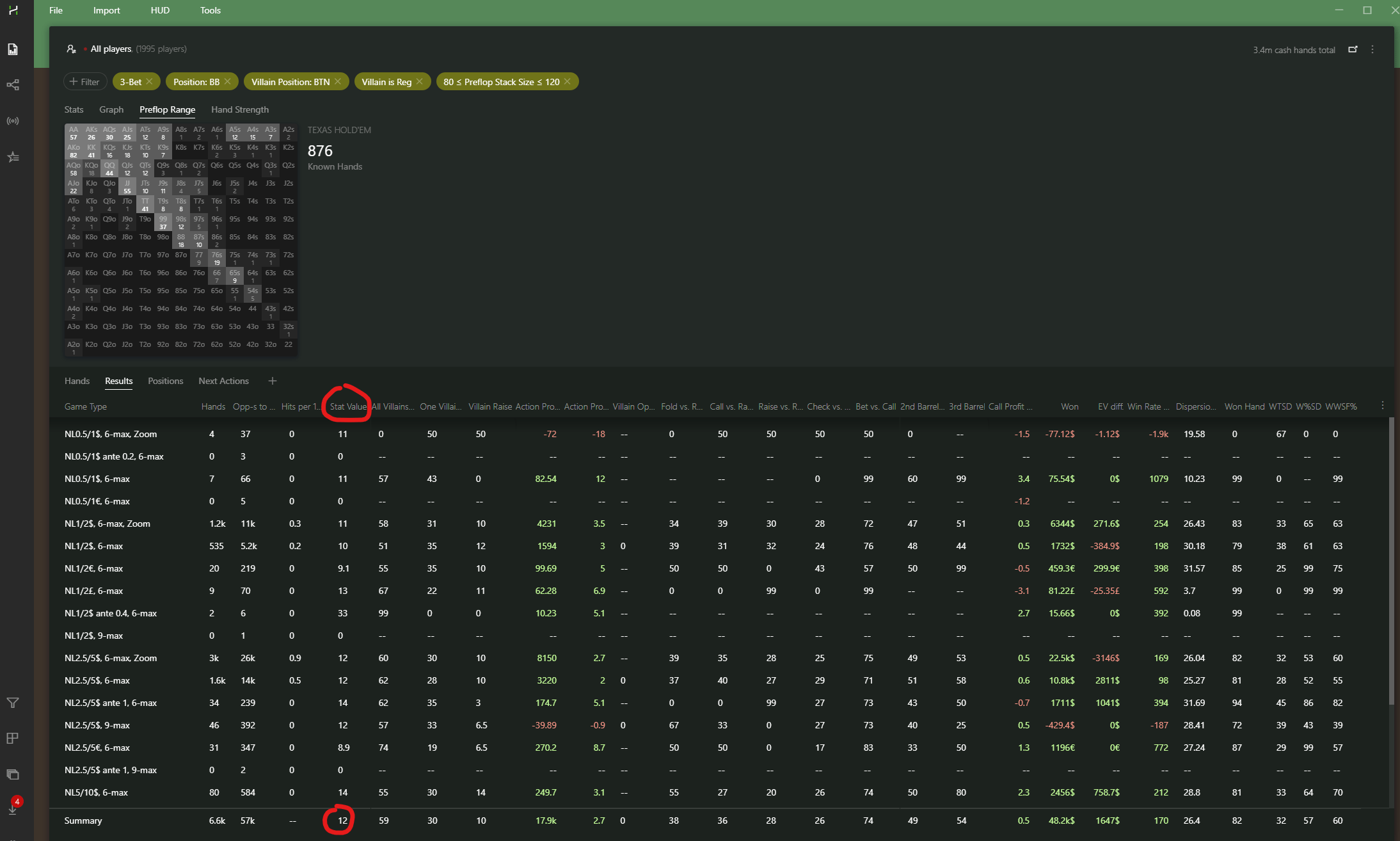 Here, summed up over multiple stakes, that value is at 12%. Which means the average player in the BB will 3-bet 12% of their hands against a BTN open raise. Provided the sample you’re working with is big enough, this value is quantitatively reliable and accurate.