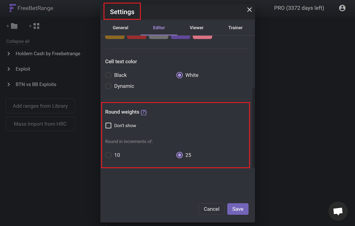 By default, the rounding increment = 25. This means that all the weights in the range will be rounded to the closest number from the [0,25,50,75,100] set. You can also configure the rounding increment in Settings: