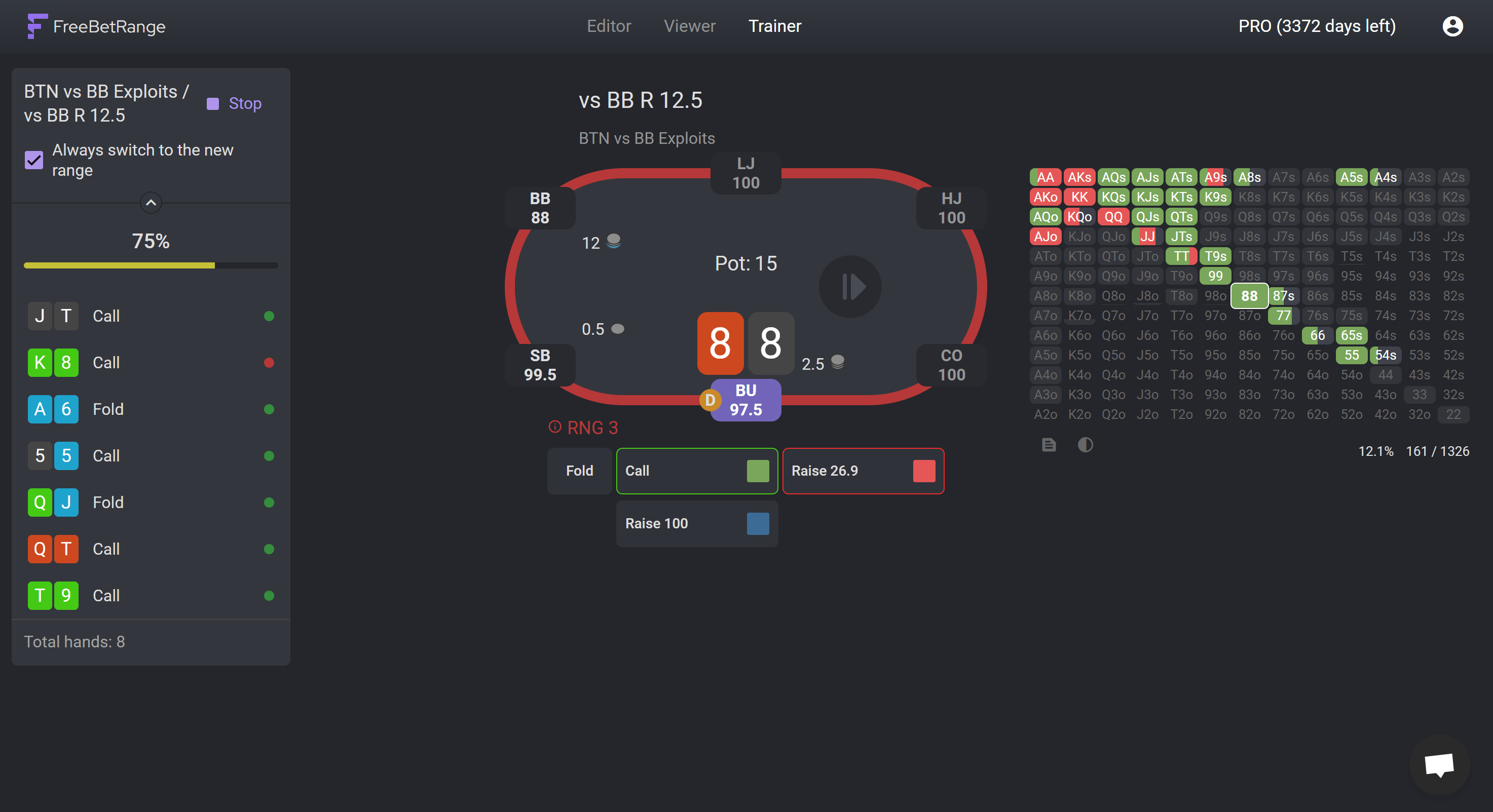 Click on “Training mode” and you’ll be able to select which hands you’re going to be asked about in the training ("Dealing coverage"). Because let’s be real, we all know that J4s is not a continue against a 3bet here. So you can select to only get asked about those hands that are comparably close in their action.
