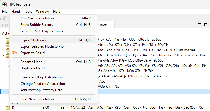 Once we’ve received these ranges, we can use them even better by importing them to FreeBetRange. For that, we simply go to HRC and click on “Hand” → “Export Strategies”.